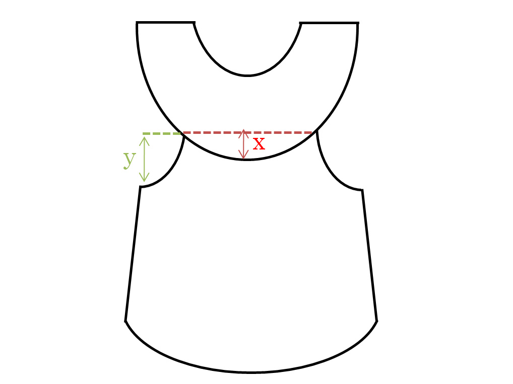 I arbitrarily decided the distance from a to b should be about three-fifths of the width of the bottom section of material. After a bit of head-scratching, I cut a curved segment of material out (photo above) between points a and b with a maximum depth of x at the centre front. The bottom section was then gathered between point a and b and sewed on to the yoke, front and back. Once this was done I tried the top on to decide on measurement “y”, the armscye depth and cut out the shapes accordingly.