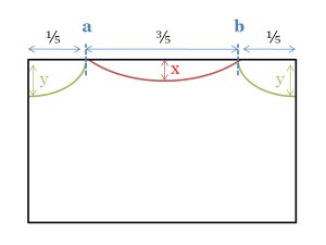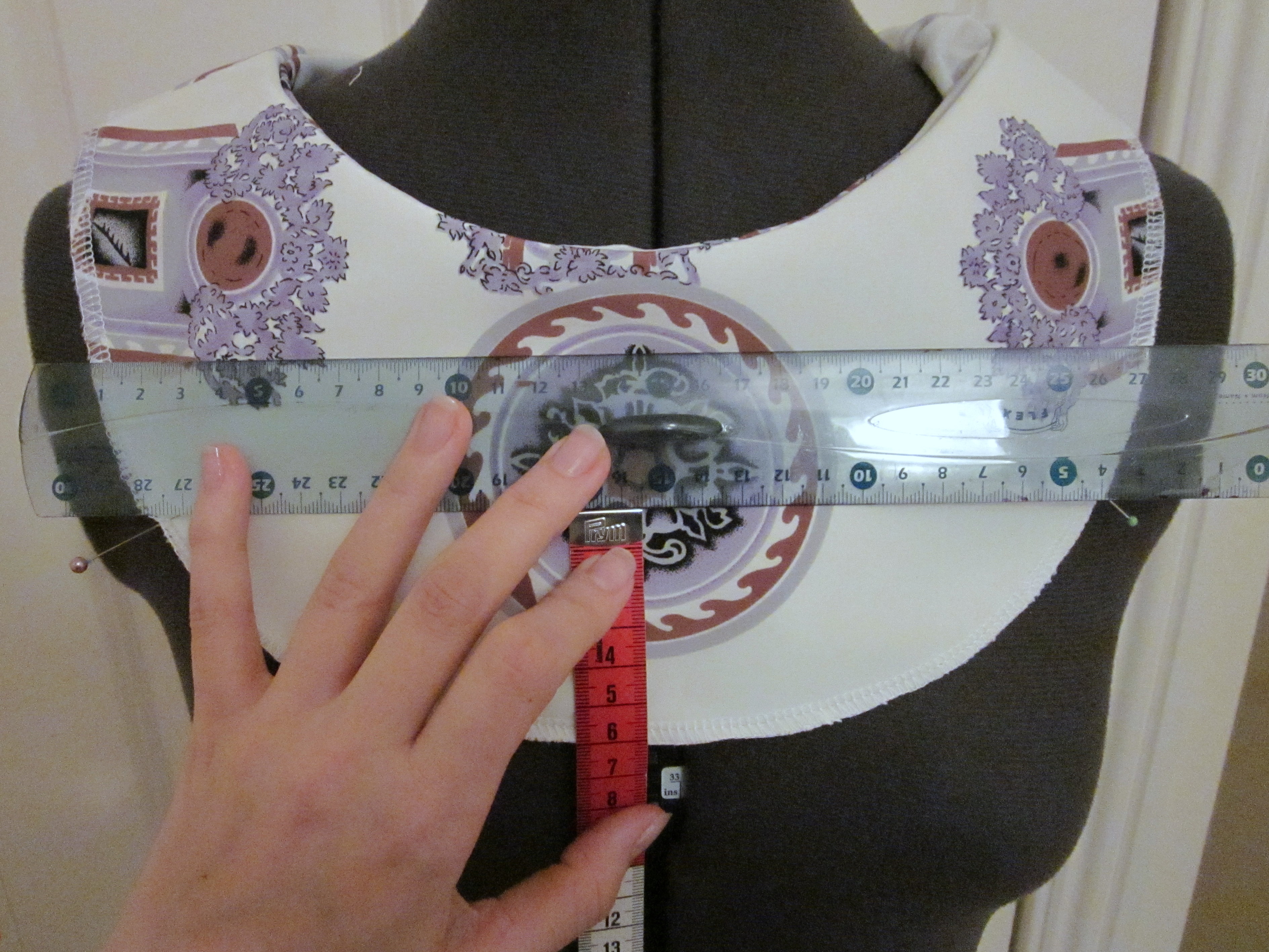 To sew the bottom half onto the yoke, I needed to trim it to the right shape. This was a slightly roundabout way of doing things but here goes: I decided where, on the yoke, the bottom section would hit, ie, where the armscye would begin (marked in the pic below by 2 pins). These two points are designated “a” and “b” for the purposes of this explanation. Then measured the vertical distance between the pins and the seam along the bottom of the yoke (red measuring tape), which for the purposes of this explanation, is called “x”.
