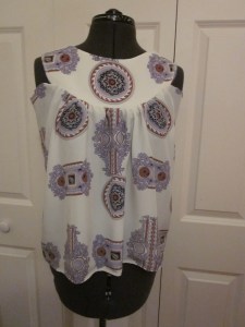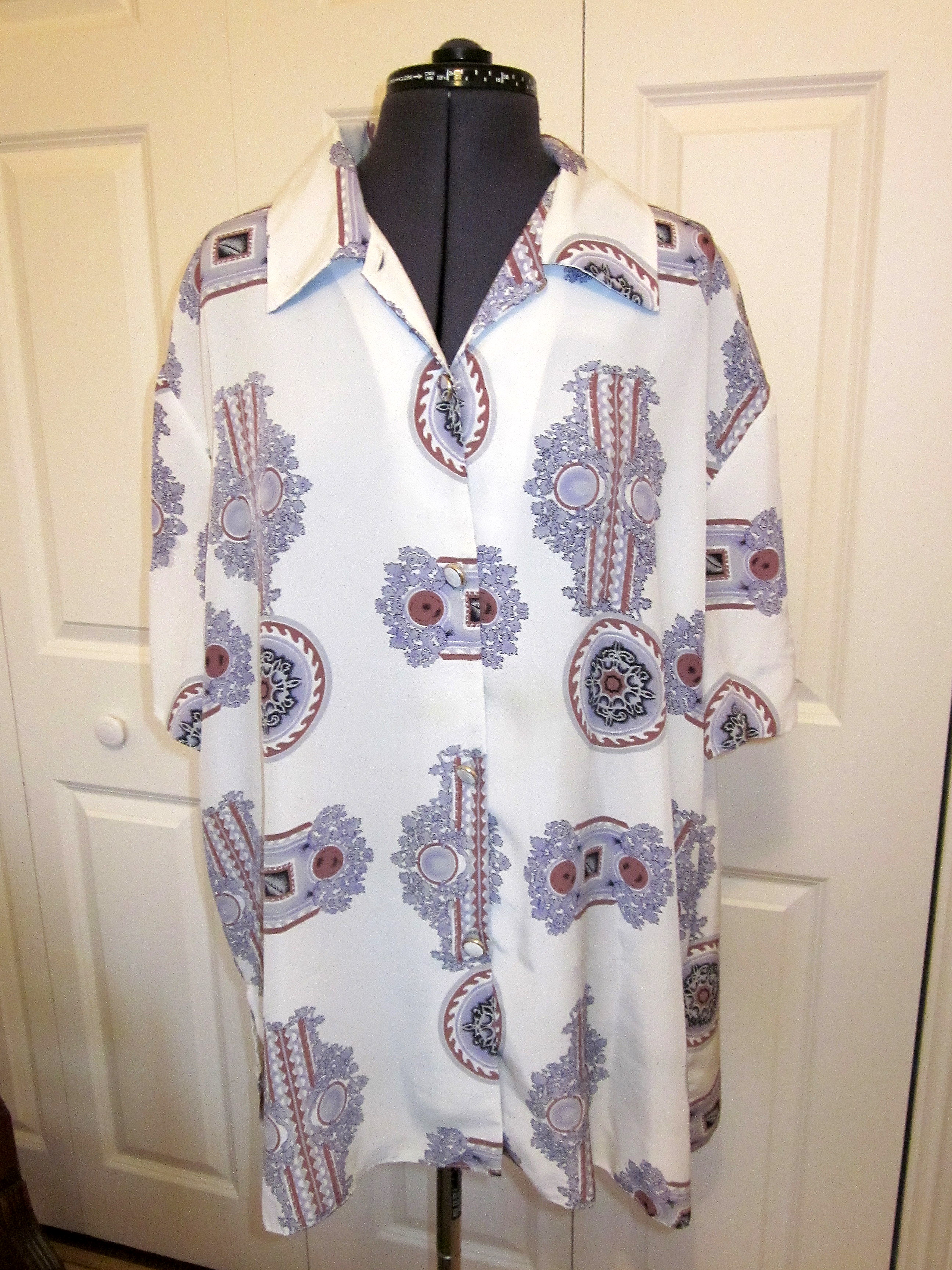 OK, I admit that I bought this garment as a challenge. It is hands down the ugliest garment I’ve ever seen. It would be difficult to conceive a garment that had less potential than this 100% polyester monstrosity that looks like something Pat Butcher might wear on laundry day.