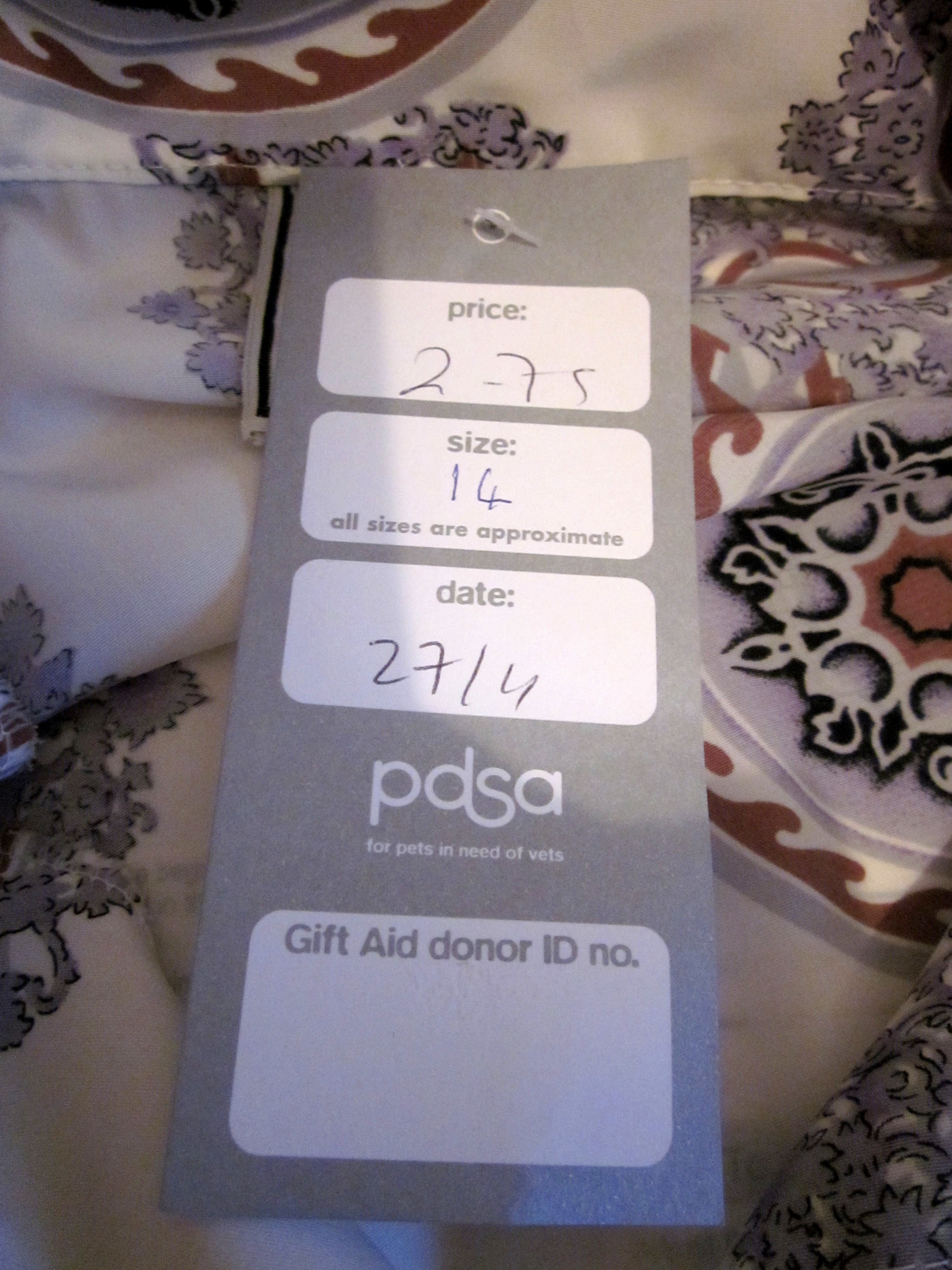 Features of this blouse include particularly heinous self-covered buttons and a grecian-inspired print in colours which can only be described as washed-out pot-pourri lilac, chicken balti brown, mild snot and black. This came from Barking PDSA and cost £2.75.