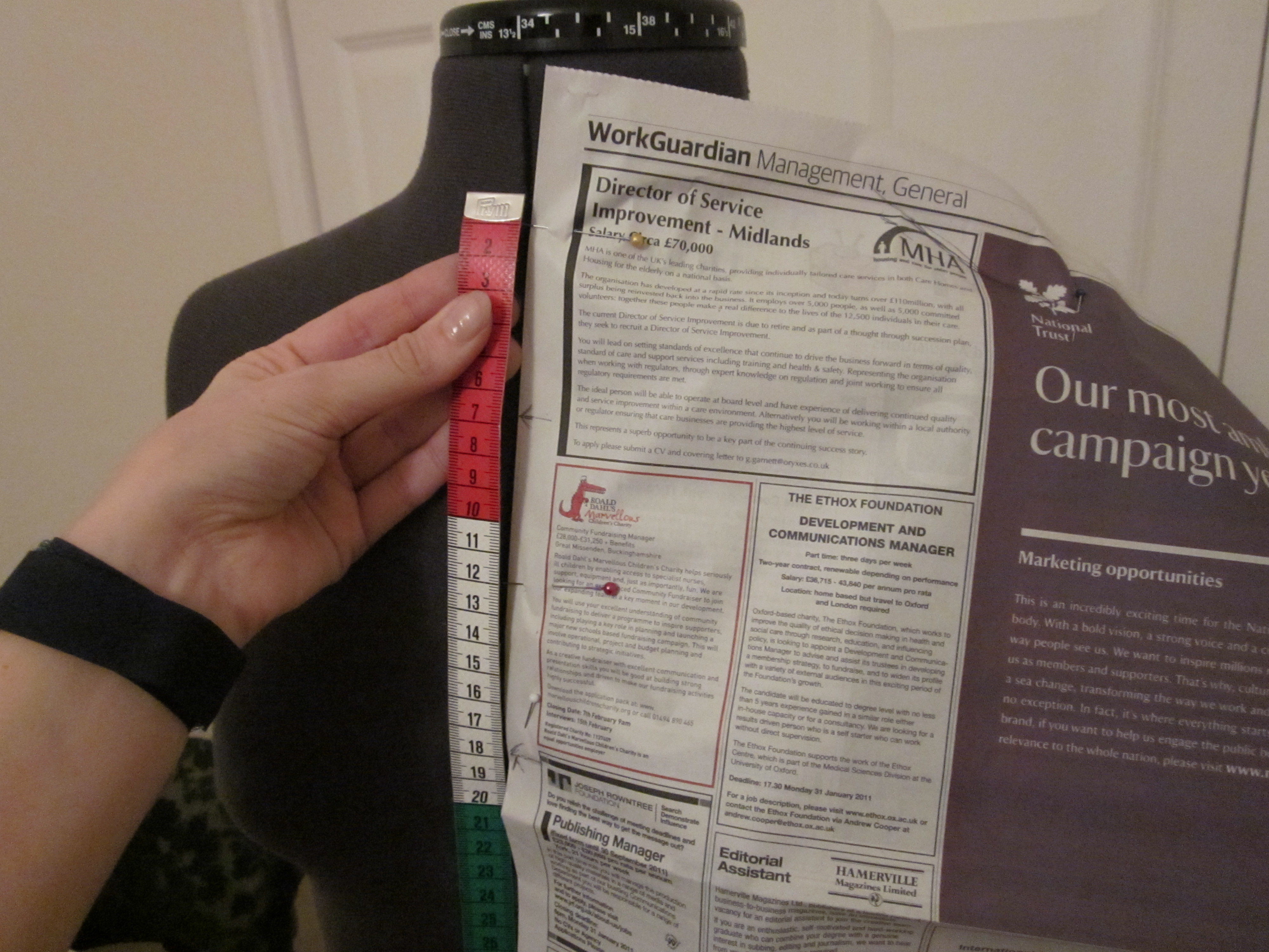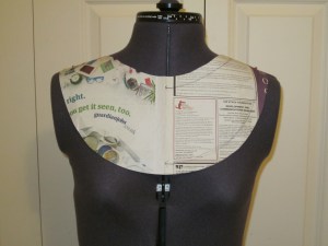 I thought it best to stick with the grecian theme and decided a grecian-style top was probably my best bet. First step was to make a ‘pattern’ of sorts. The top part of my design was a bib section front and back (yoke?) under which there was a gathered section that did not require any closures (just as well, since the self buttons went straight in the bin, and I don’t think they make zips in chicken balti brown). I began by deciding roughly how wide the yoke should be and drawing the rough shape that I wanted, with help from my dummy. I used newspaper for this – using the fold of the broadsheet helped me get it symmetrical! Added seam allowances and tried it on the dummy, adjusting where necessary. Don’t forget to ensure you’ll be able to fit your head through the hole :-)
