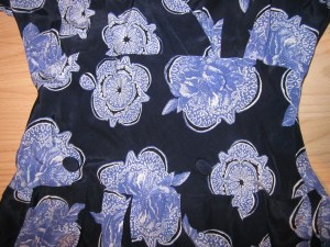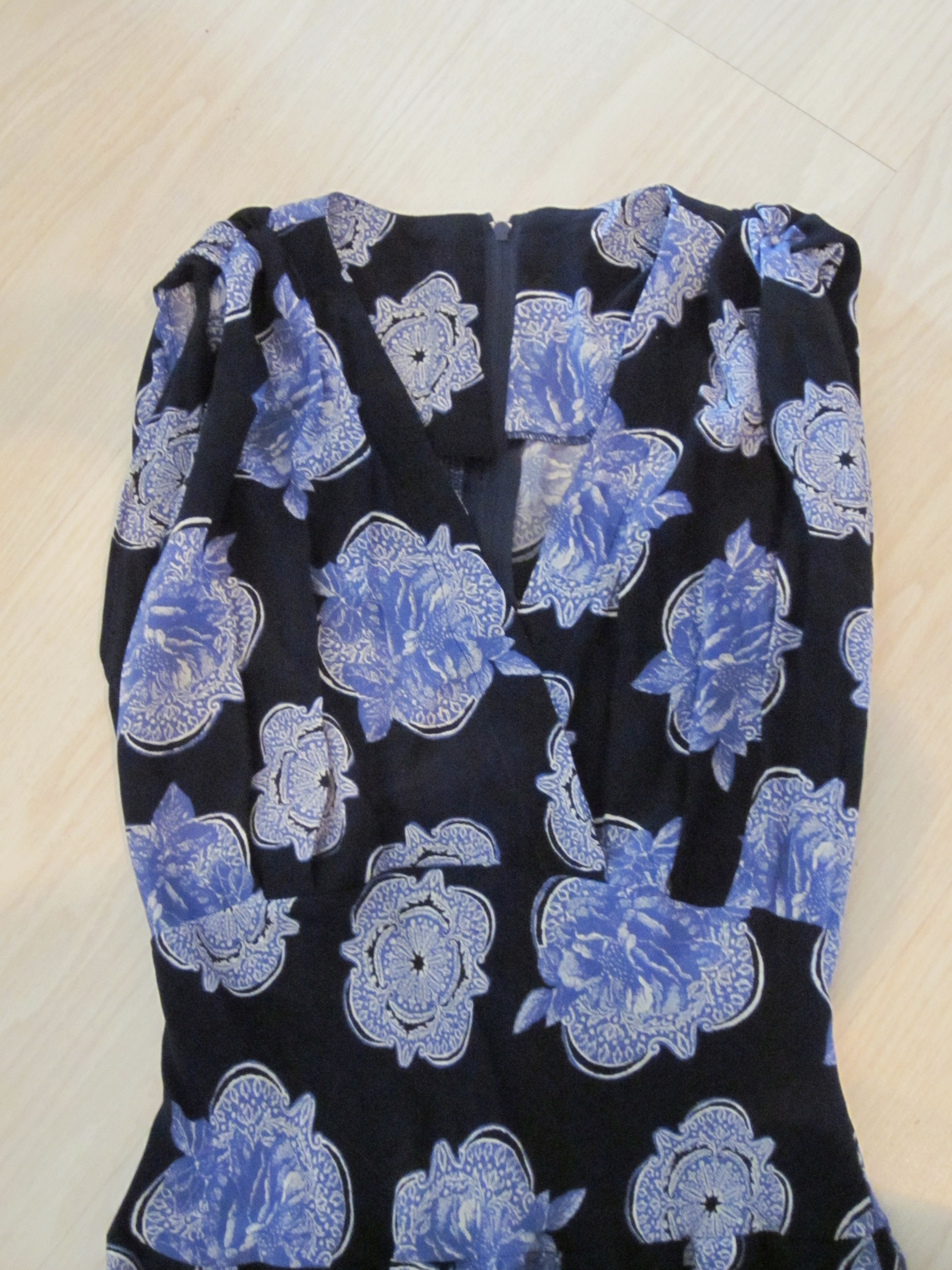 To make my own version of this dress, I bought the below from Scope in Walthamstow for £6.00. The print is really pretty and it caught my eye to the point where I put it in my basket without reading the label. It’s from around 1993 (best guess) and features enormous shoulder pads and four covered buttons on the mid section. Note that the garment label says “8 PETITE”.  I failed to notice this and as a result, in the picture of me below I am holding my breath whilst staying extremely still so as not to rip the seam under the bust open.