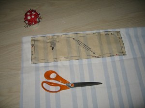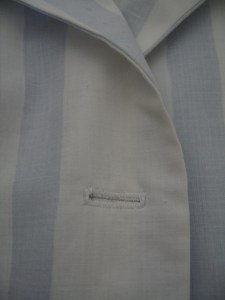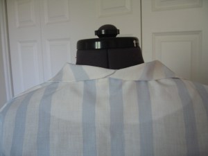 Cutting and construction was relatively simple. The pattern called for sew-in interfacing but I used the iron-on kind, being careful not to burn it. The only change I made was to cut the sleeve bands on the grain rather than on the bias. The cotton sheet had plenty of ease so I wasn’t too worried about having to stretch it a little if necessary, and I wanted the stripes on the bands to be perpendicular to on the body of the garment. I thought diagonal stripes would look a bit strange considering the width of the stripes relative to the bands.