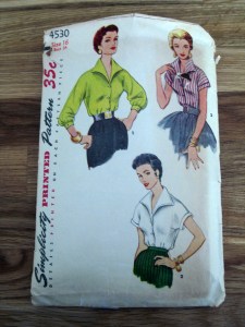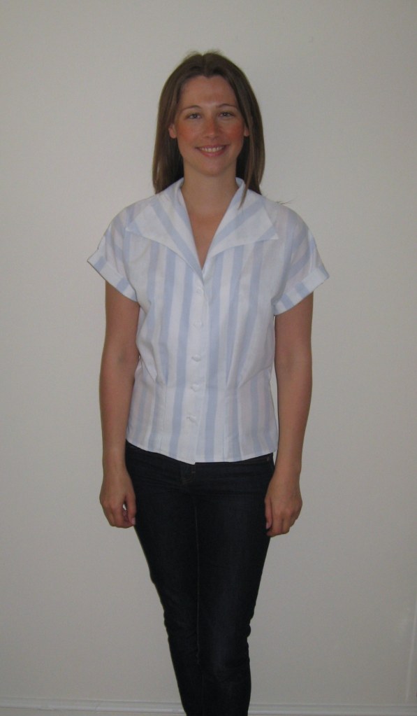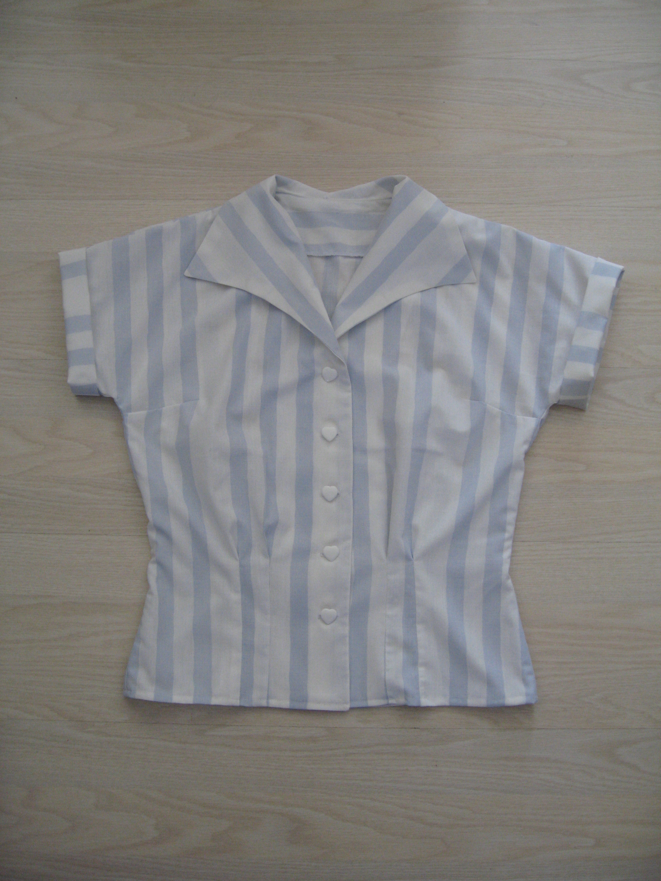 Well, there was loads left after using it as a lining for a previous project, and the pretty stripes were too good to be used as muslin. It was crying out to be turned into a summer blouse. For this project I dug out Simplicity 4530 (OOP) from my stash, where it’s been for several months since I bought it on Etsy. The pattern is a simple summer blouse with a large pointy collar. I chose the short sleeve version (similar to the top right image on the pattern envelope). This pattern is marked “Copyright 1953” and it makes me smile to think of the pattern being used 50 years ago :)