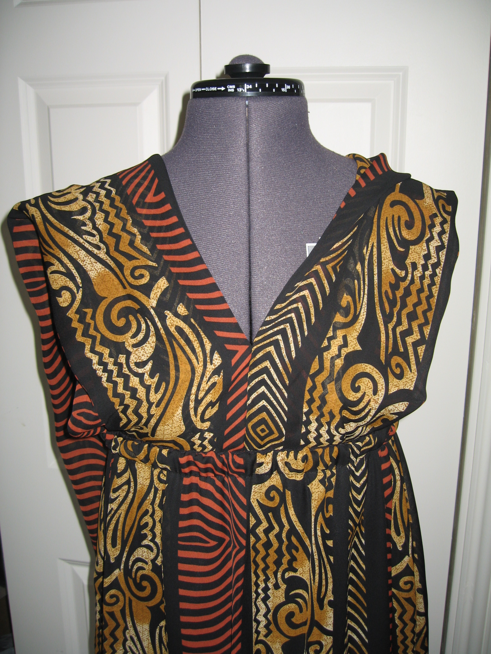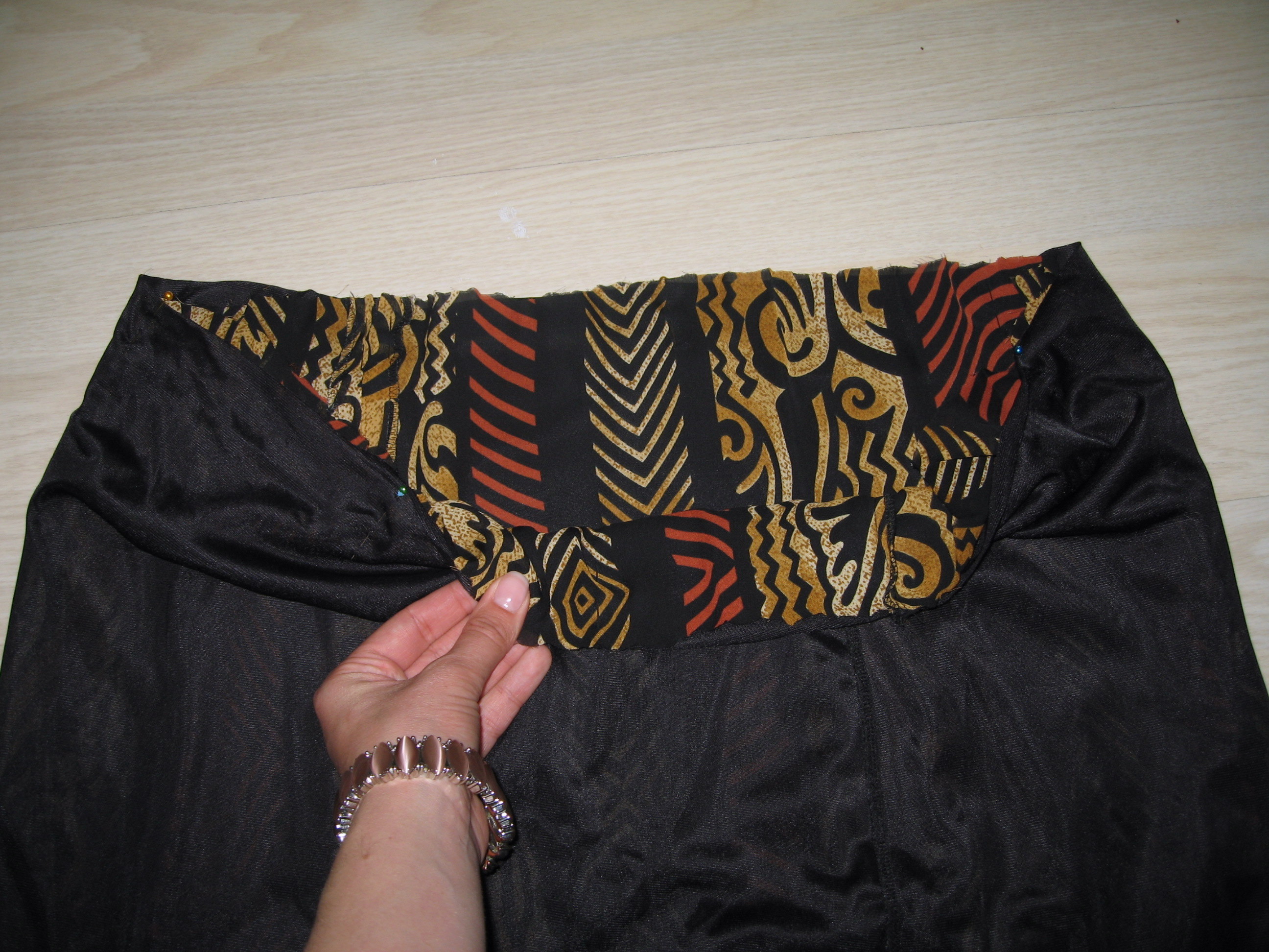 After another session of trying this on to determine the right bodice length, both ends were sewn to the skirt part at the bottom of the elastic casing at what was to become the empire waistline.