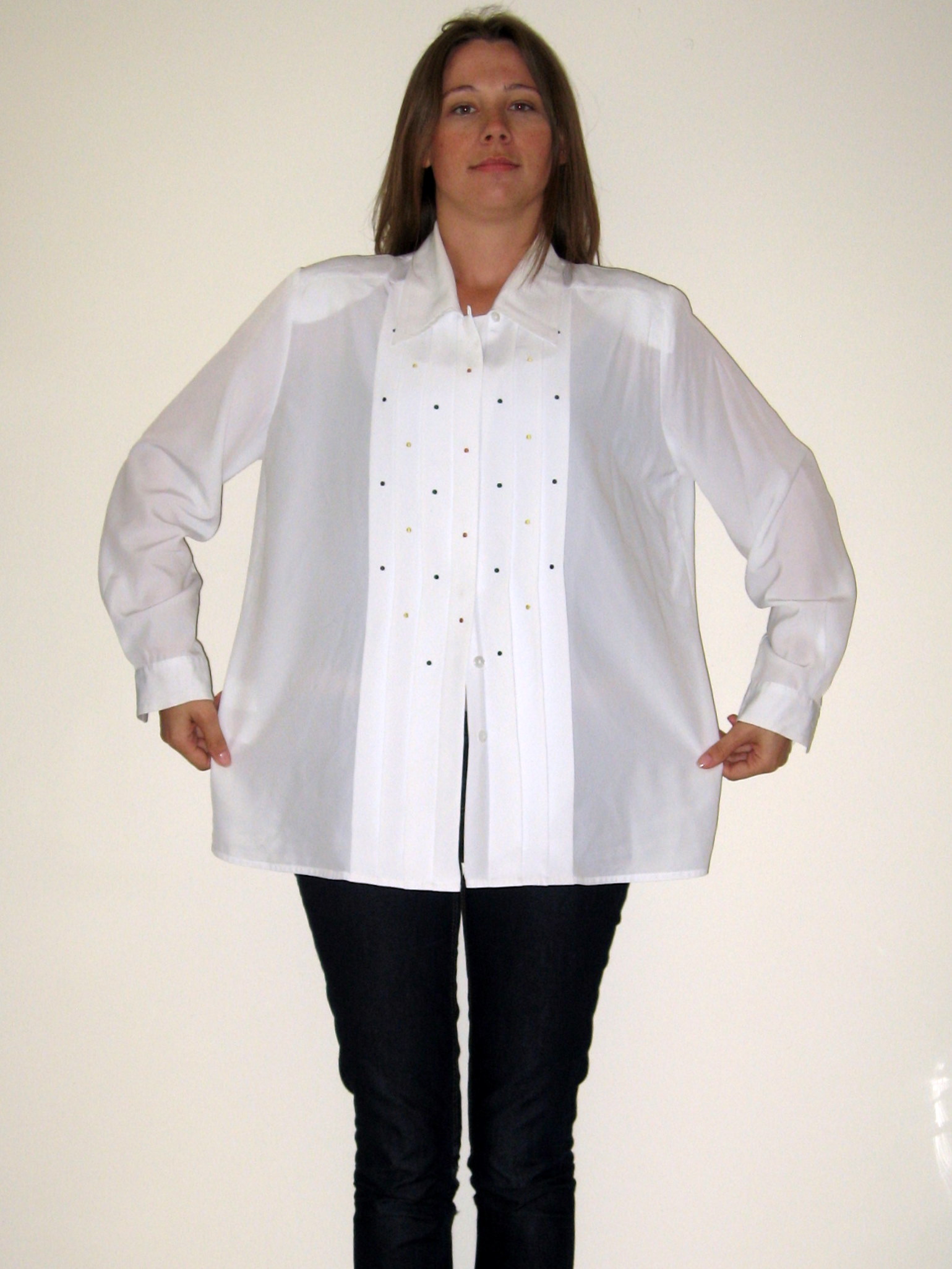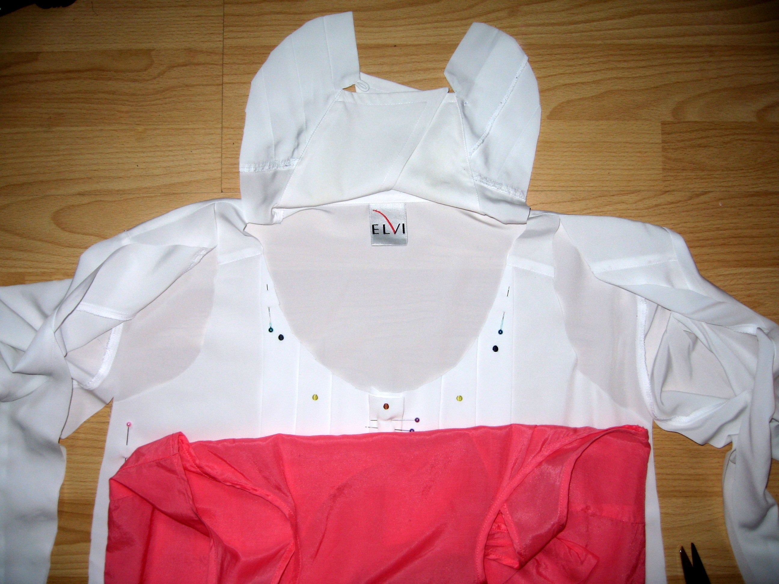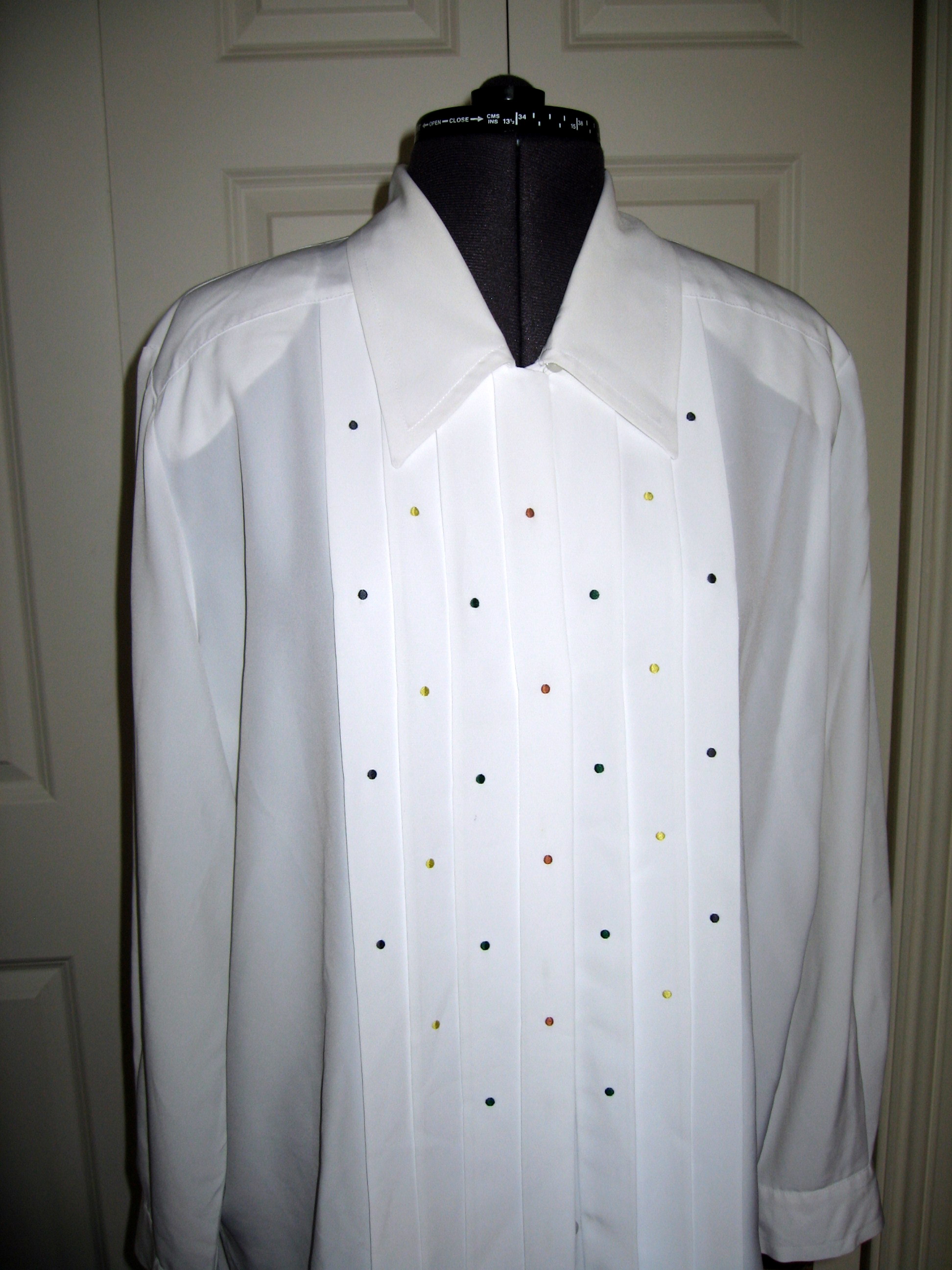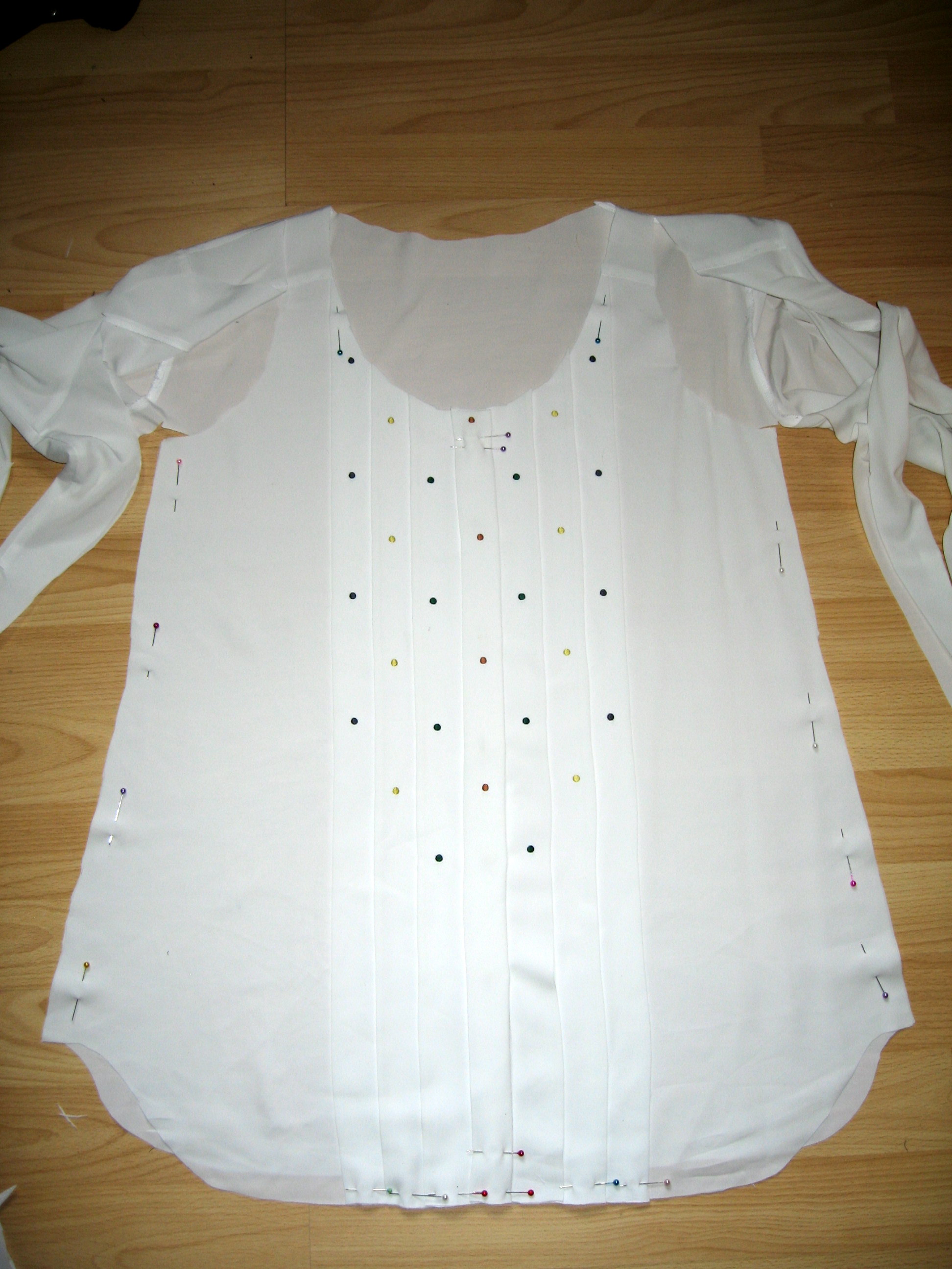This one came from a charity shop in South Woodford that supports Heal, the Helen Rollason Cancer Charity. It cost £6. The blouse is made of a thicker, more drapey polyester and has a series of pleats either side of centre front which also cover the button placket. The pleats have multi-coloured dots embroidered on them, and it is these subtle but interesting dots that enamoured me to this blouse. It was a size 16 which gave me plenty to play with.