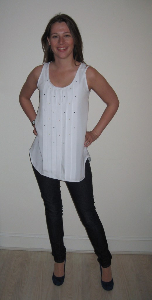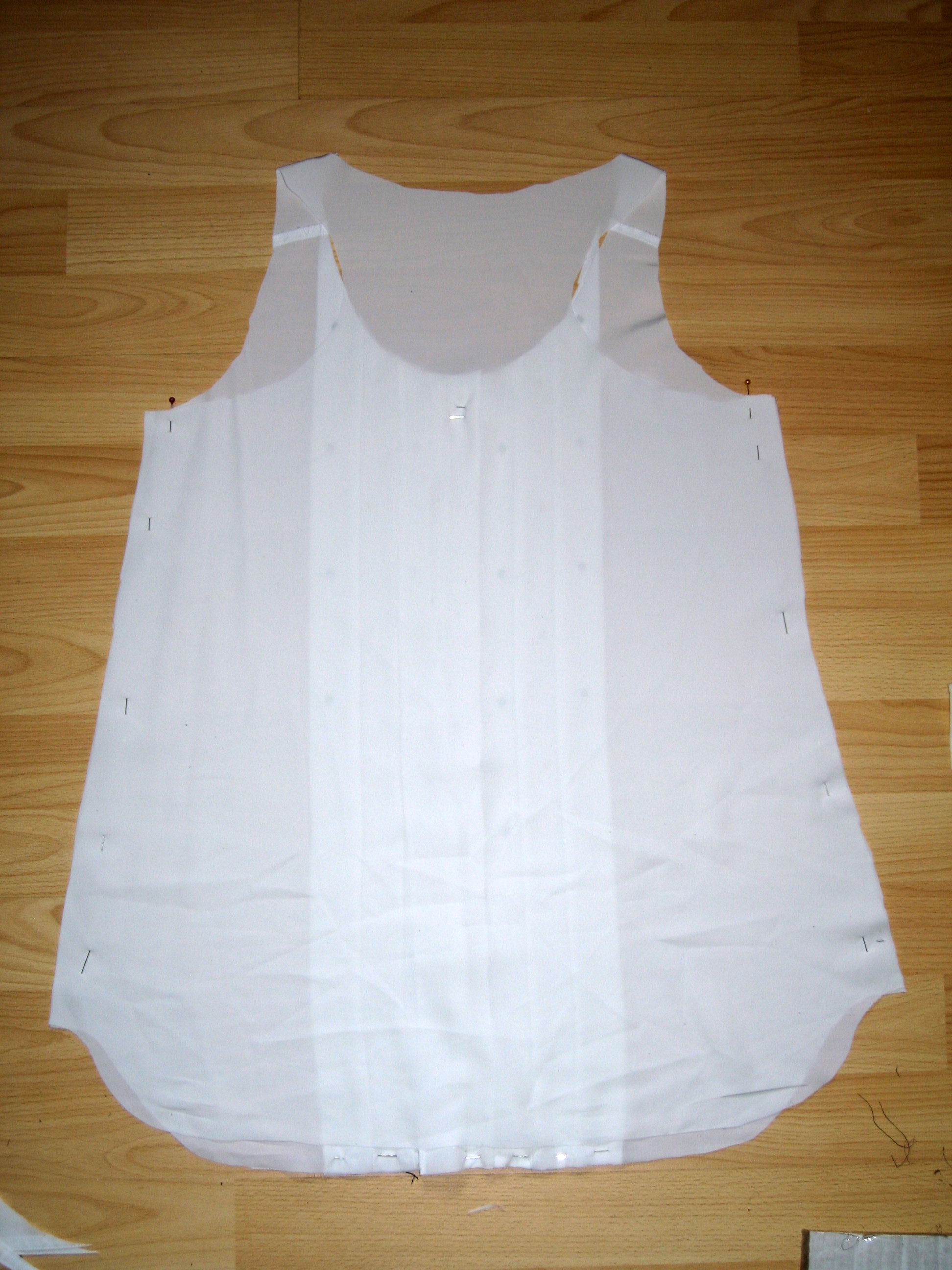 My idea was to turn it into an oversized vest top, keeping the pleats front and centre. First things first, the shoulder pads came out. Then I grabbed a well-fitting vest top and, using it as a pattern, simply trimmed the blouse roughly 1.5cm around the top on all sides. The front and back of the vest/pattern are different – the back is a racerback style – so when I got to the underarms I just cut the front layer and turned the whole thing over to do the back. By placing the vest/pattern with its shoulder seams level with the shoulders of the original blouse I avoided having shoulder seams. There were already yoke seams from the original blouse so I didn’t want to have to add any more. I also trimmed the hem in the rough shape of the pattern.