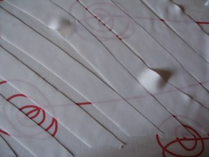 For the hem, armholes and neckline I made some bias binding from one of the sleeves. Bias binding is really easy to make – I have a metal utensil which makes it very easy to do without burning your fingers! You just cut some strips of material at 45 degrees to the grainline to keep it nice and stretchy, join the strips together, and use the utensil to iron the outside edges of the tape into the centre, a process which is supposed to be illustrated by the images below.