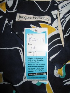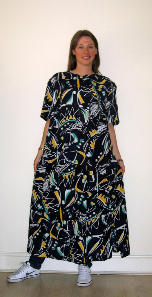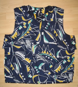 Believe it or not, this is my most expensive piece to date! £14.99 from Save the Children in Whitby. It’s actually two pieces, a size 18 blouse and skirt in thin polyester. The pattern is so 80s… I love it. I mean, it’s about as 80s as it could be if it’s not visible white socks and mens suit jackets with the sleeves rolled up. The pattern actually reminds me of yachts – it’s straight out of ‘Howard’s Way’.