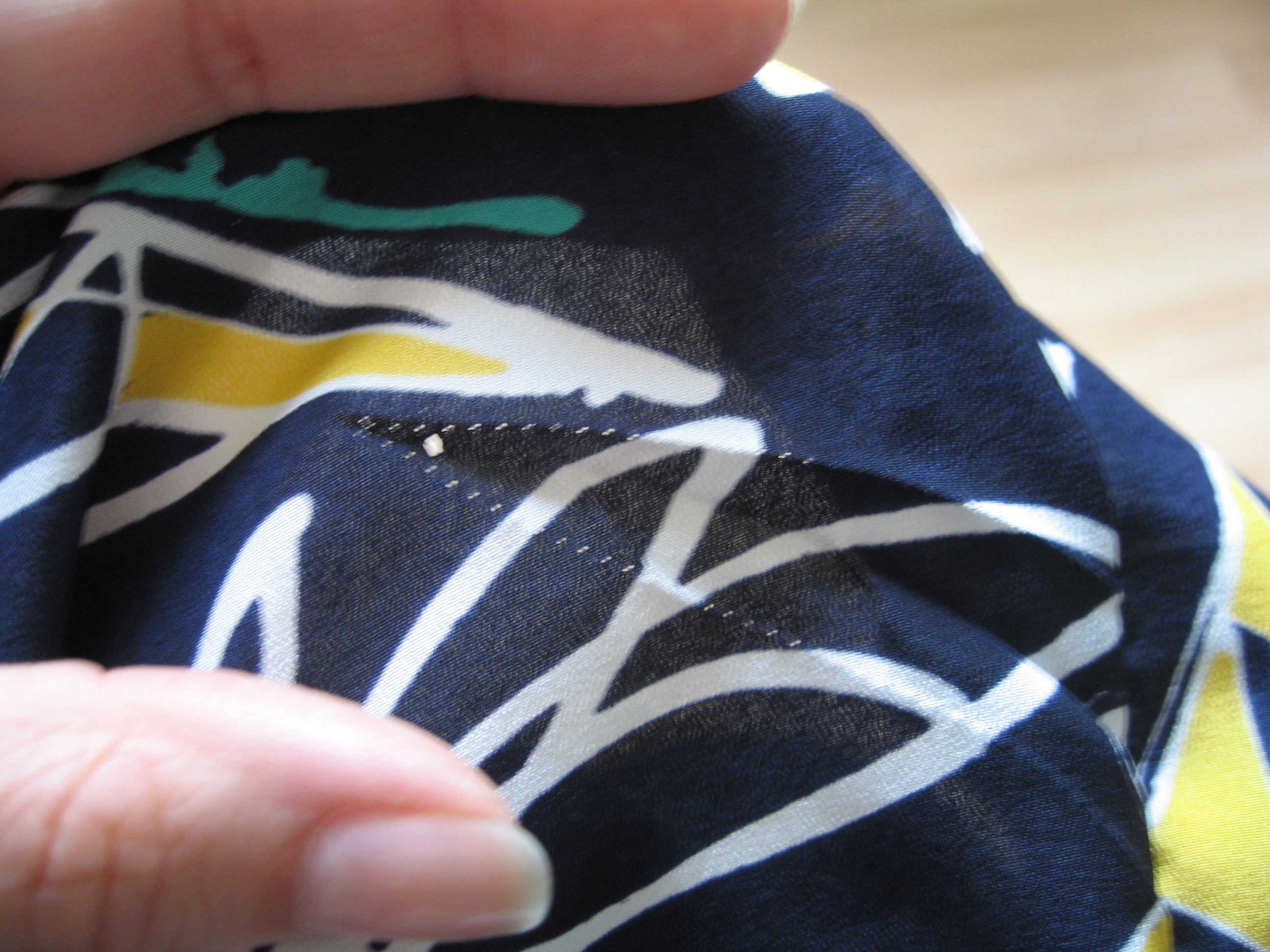 Mass production techniques from the original garment unfortunately had left a hole in the fabric at the point of each of the original bust darts. The position of these was such that they were visible on the side front of my new blouse. In the end I decided to just live with it. Probably only me (and you, now you’ve read this) will notice.