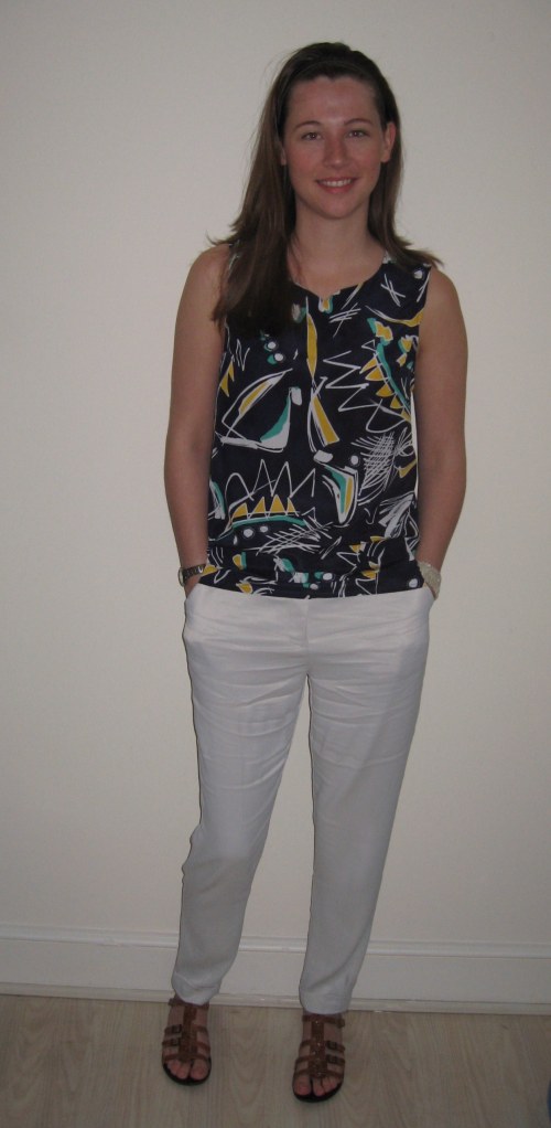 I toyed with the idea of making binding for the armholes but, short on time, I just clipped the curves as best I could and folded over. It doesn’t look perfect, but it’s good enough. Here I am modelling the new blouse with my new slinky white satin summer trousers!