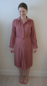 Today’s quick and easy refashion is a vintage dress I found in Scope in Walthamstow for £5.50. It has enamel buttons on the front and cuffs that are the same colour as the fabric. The fit wasn’t too bad but the style was looking a bit dated. There were extremely ugly belt loops sticking out and the self fabric belt was long gone. There’s a shirt style pocket on the front and the centre front pleats on the skirt were sewn closed over the hips…. frump city!