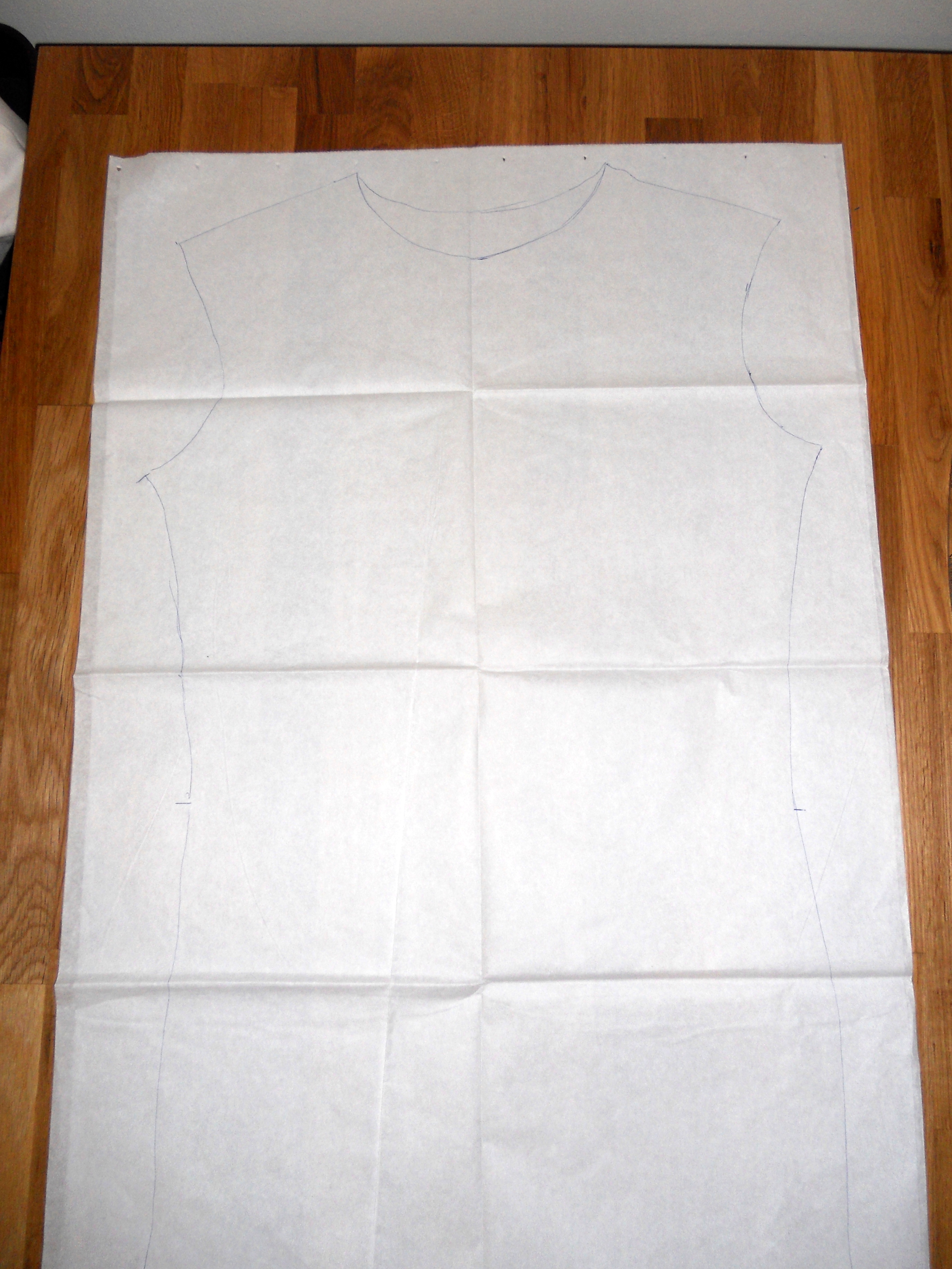To make a pattern for this dress I used a jersey dress that I already own and like the fit of as a template. I literally used paperweights and drew around it (not the sleeves) on pattern paper to make a sort of jersey dress block. I folded the paper in half down the centre to check that both sides were approximately the same and then traced it off twice, once with the front neckline and once with the back neckline.