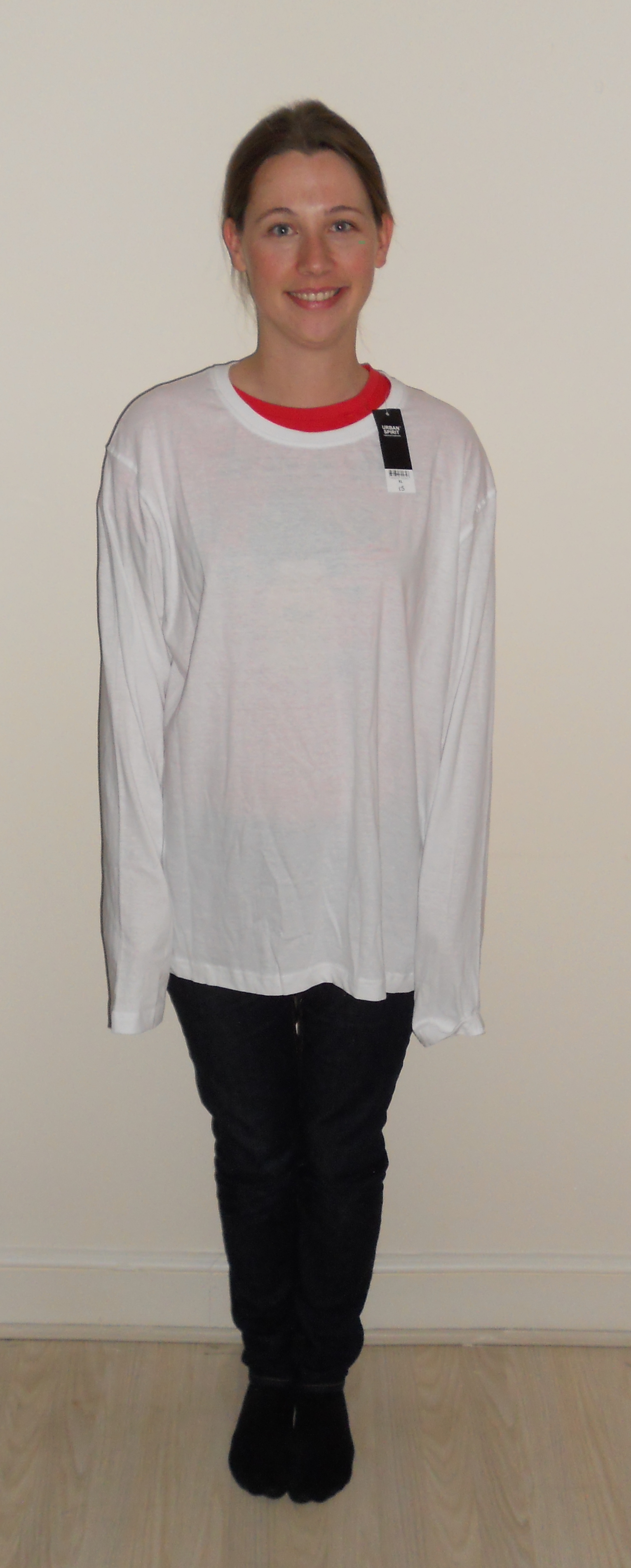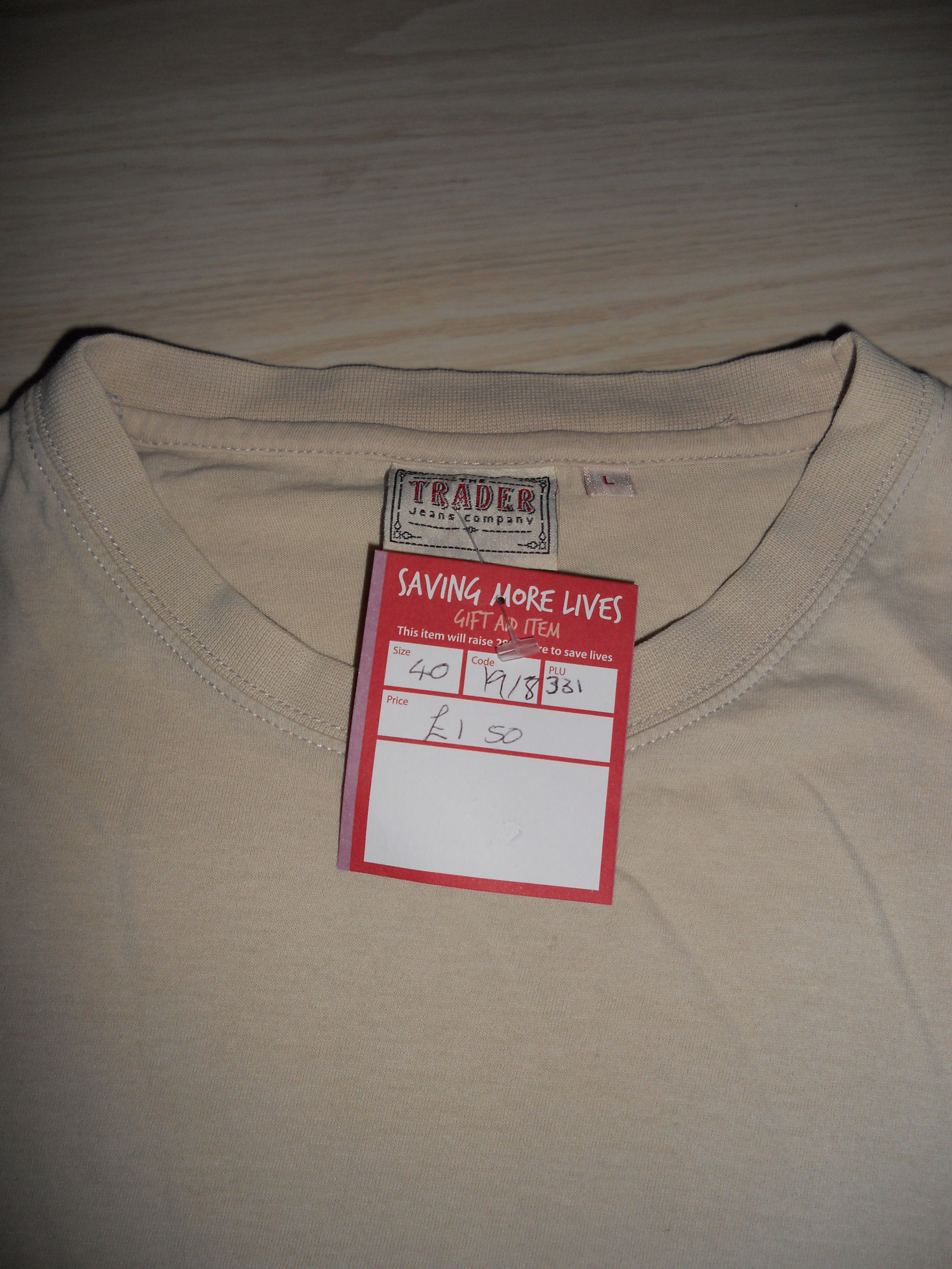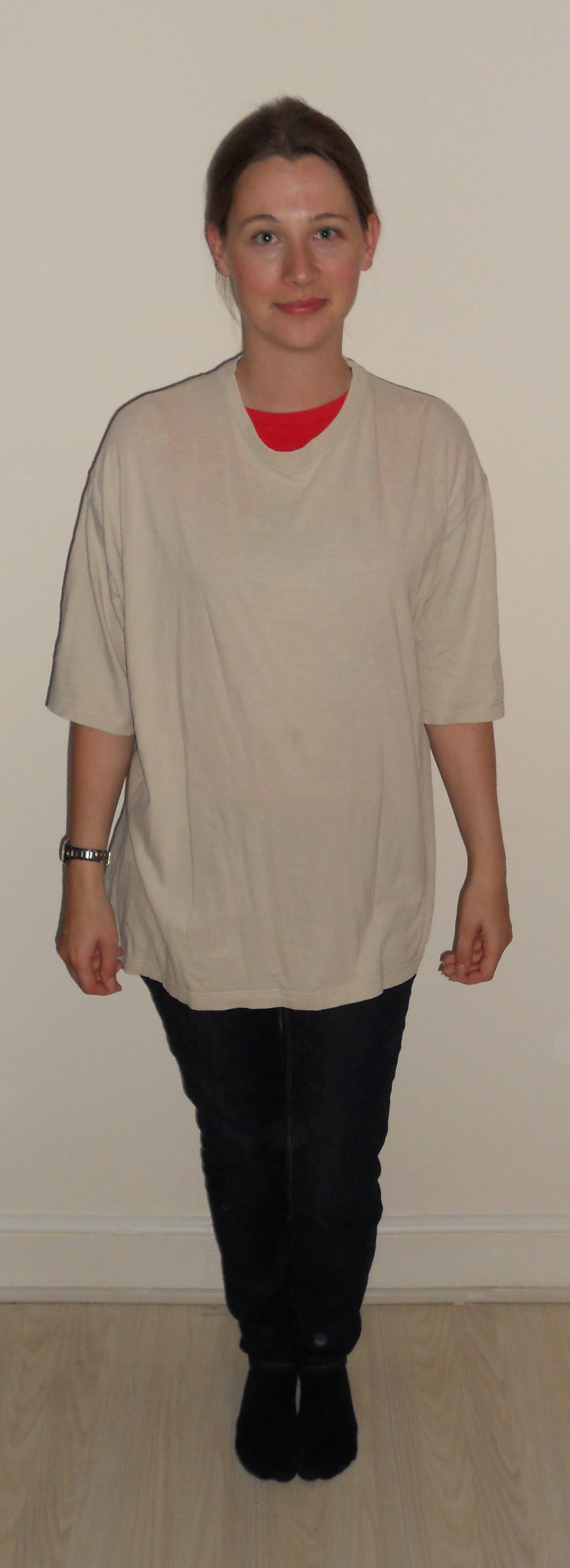 Now, the beige T-shirt had some issues. It wasn’t as big as the black one, and the material was much thinner. It was worn, in places to the point of bobbly, and very very stretched. It also had a stain on the front which I only noticed once I got it home… typical!