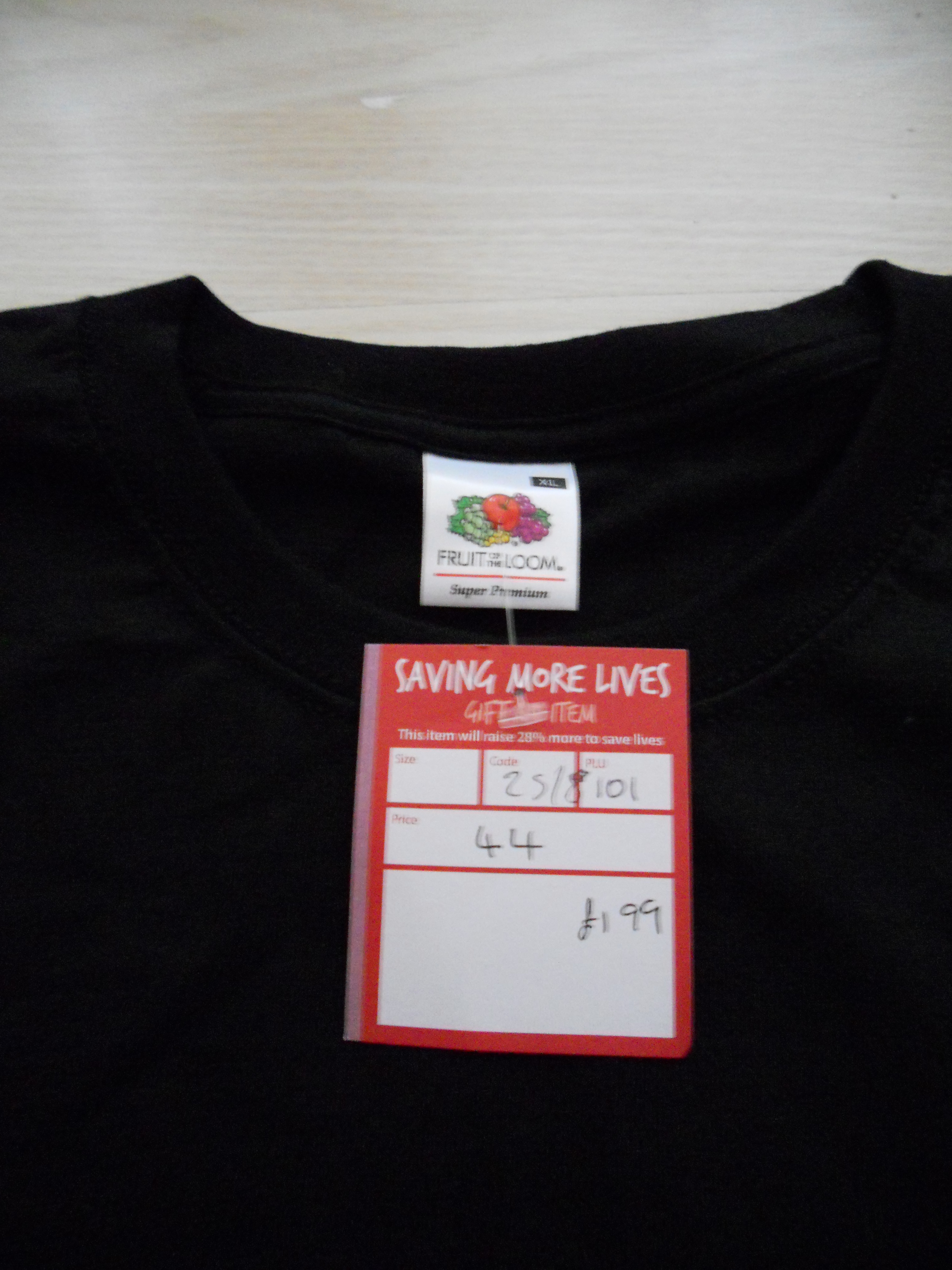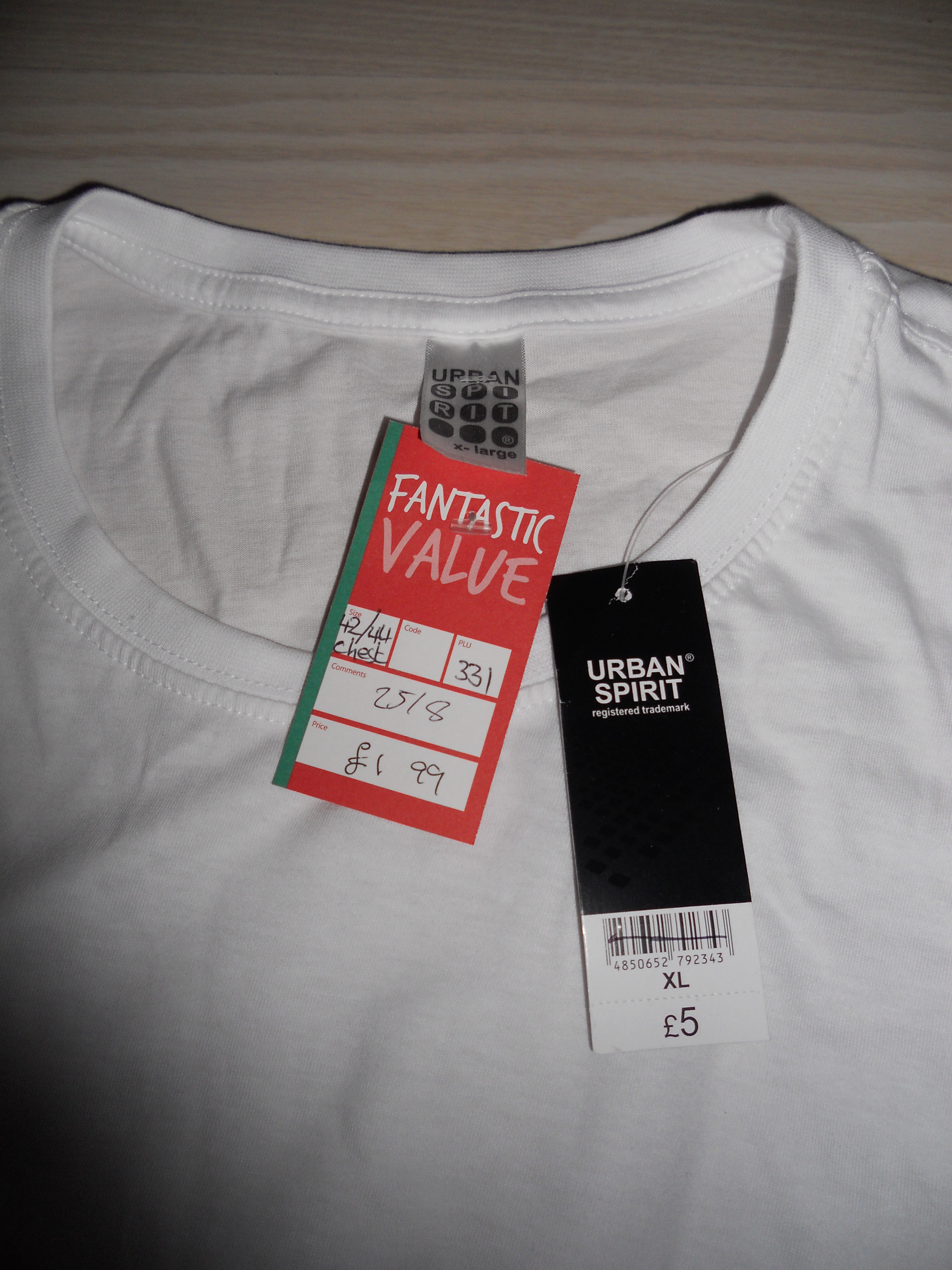 It didn’t take long to find suitable black and white T-shirts, but the plain beige one was a lot harder to come by. I eventually got all three from the British Heart Foundation shop in Gravesend. The black one (as new) was £1.99, the white one (still new with tags) was £1.99 and the beige one was £1.50.