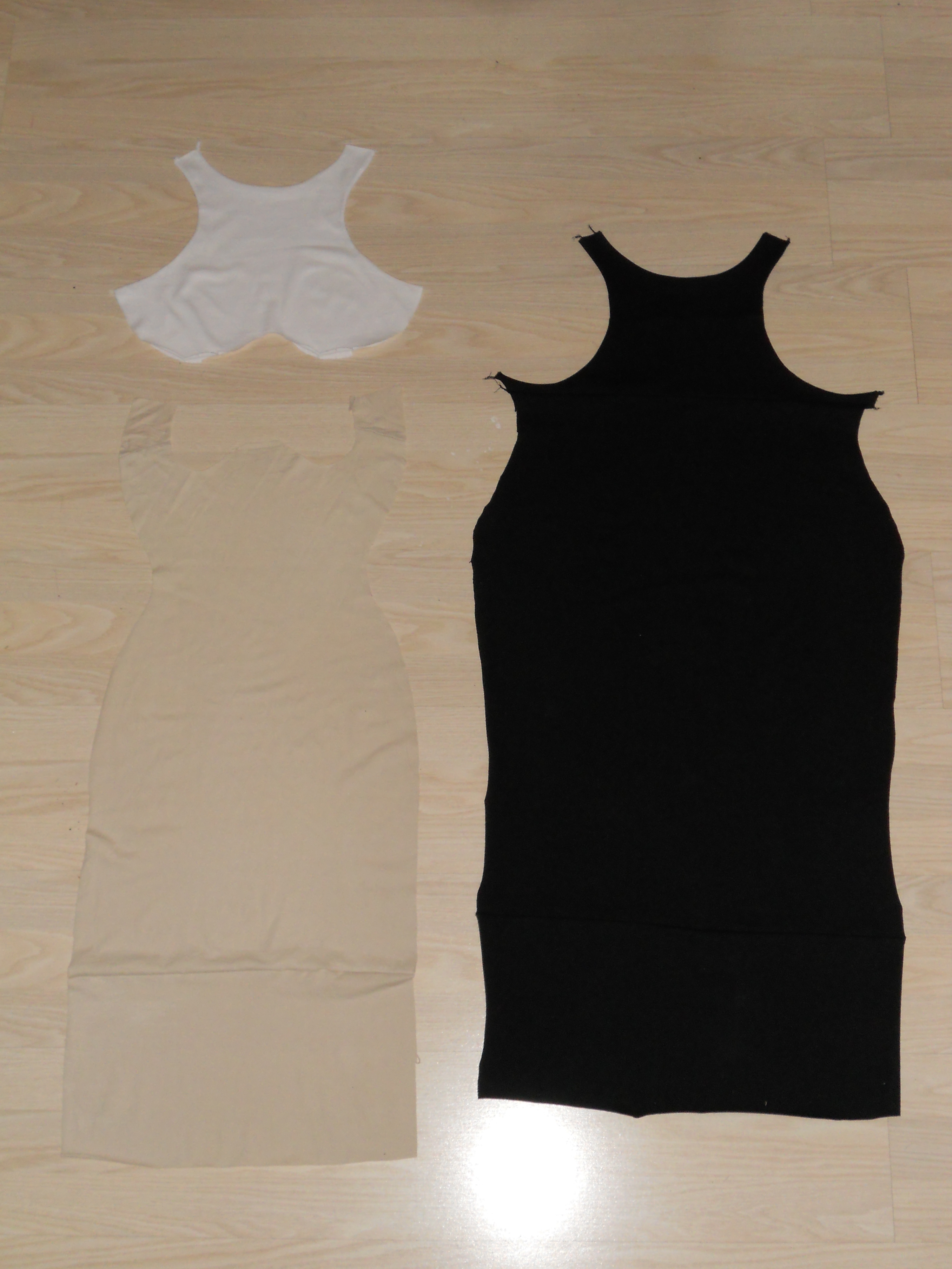 You can see that the beige and black pieces are pieced. On the beige, there is a seam across the skirt and there is also what’s left of the shoulder seams just under the underarms. The black piece has two seams across – one at roughly the same level as the skirt seam on the beige (but not the exact same) and one between the armholes. Unfortunately this is what happens when you work with recycled materials!
