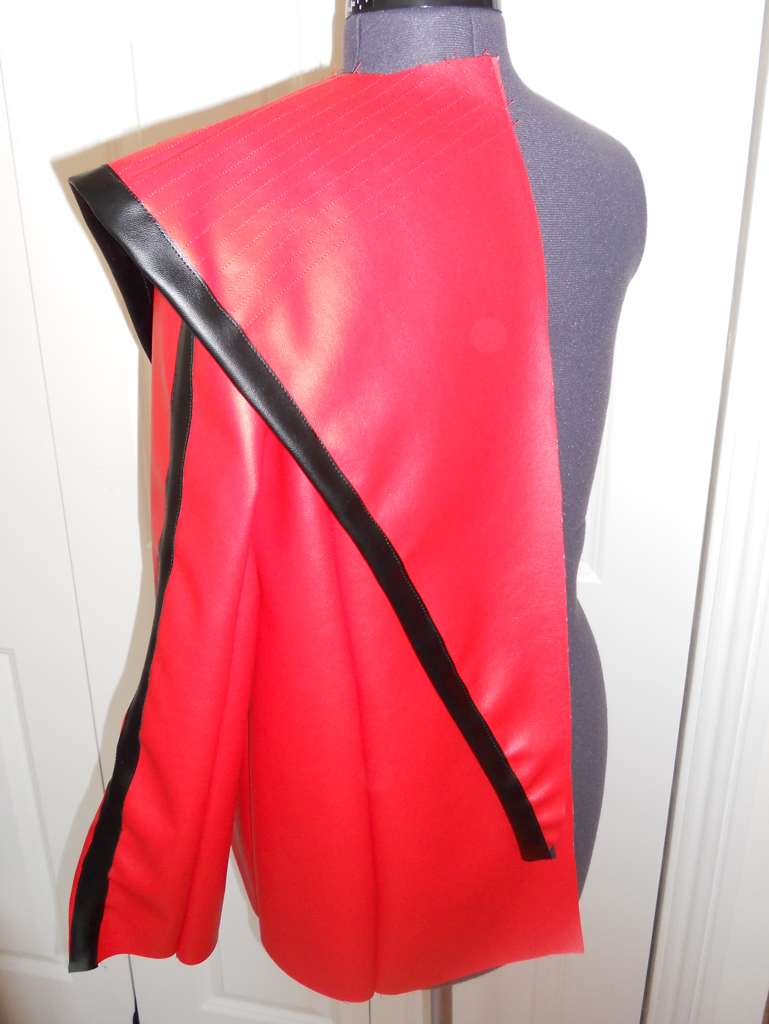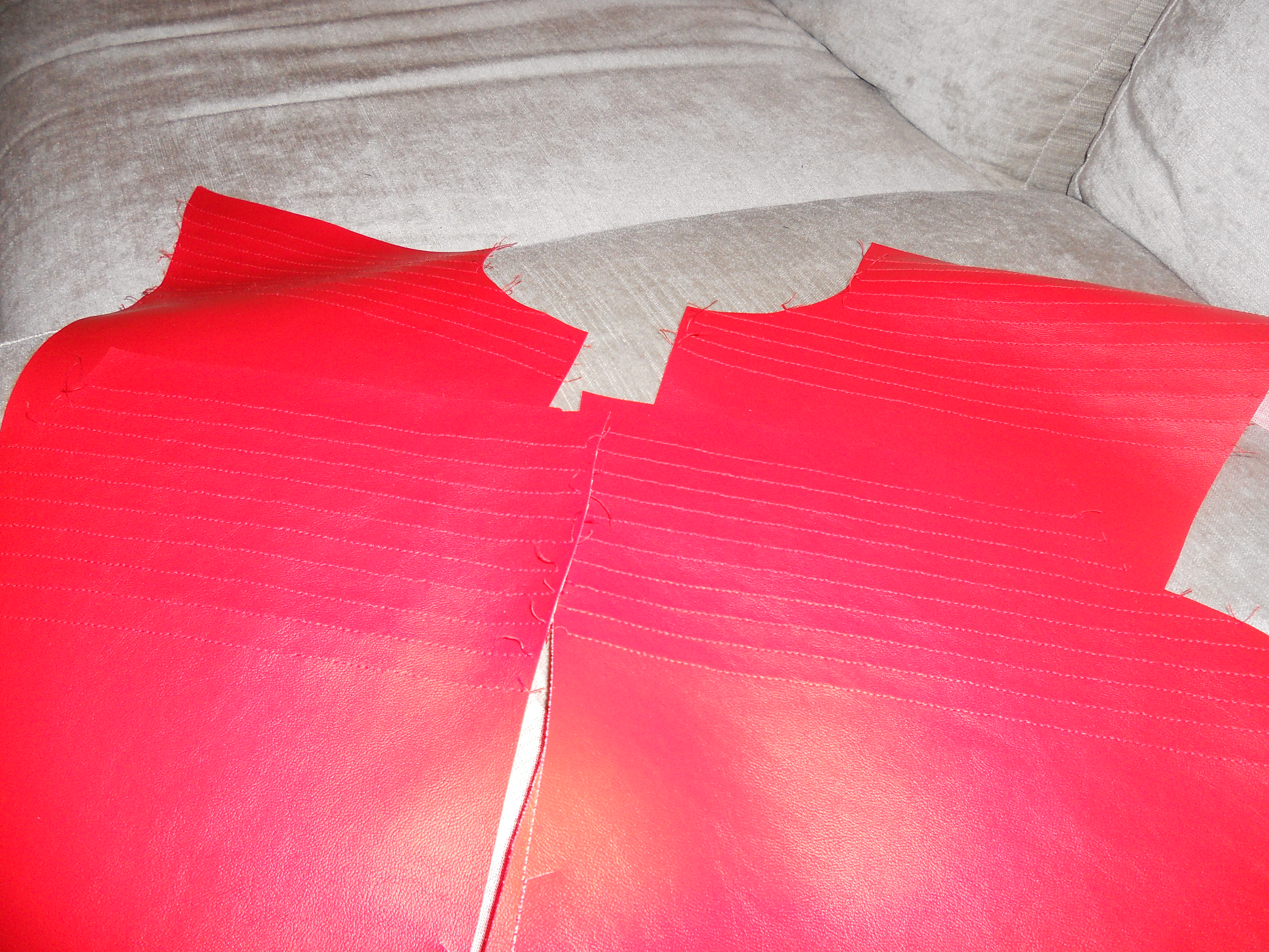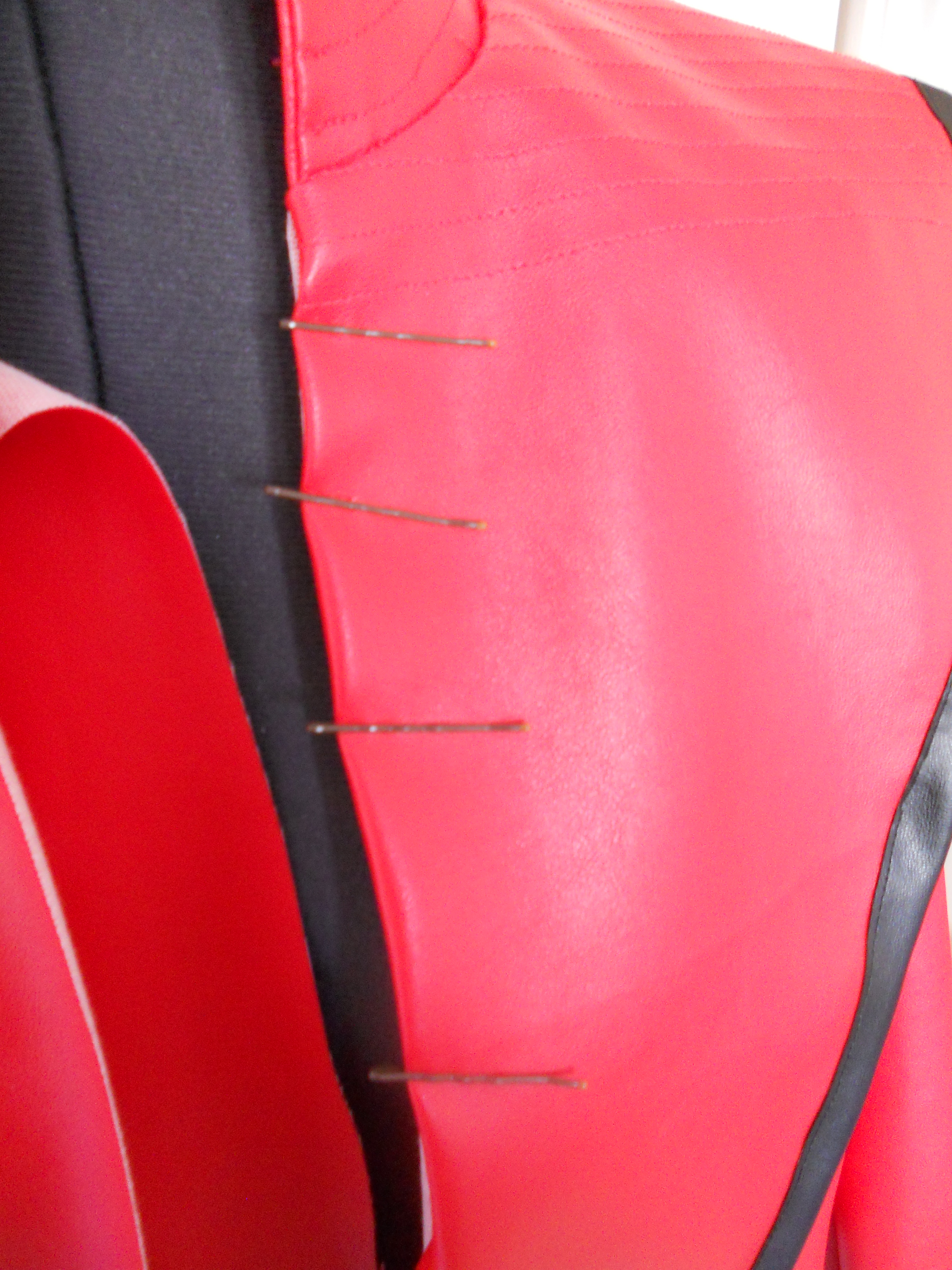 On closer inspection it’s thick leather-look plastic. Not the first choice for a garment maybe, but fine for a costume, and if any0ne out there owns an American Diner and needs to recover the seats, well, you know where to go.