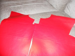 Unfortunately my trawl of all my favourite charity shops did not produce any cherry-red leather jackets suitable for modification. With time running out, it had to be made from scratch. But where to buy cherry red and black leather-effect material at bargain basement prices? With barely a hope that I might find something I headed to the wonderful Textile Centre in Walthamstow, thinking they might have some heavy red material that could be used at a stretch. Within 5 seconds of walking in the shop I spotted an extensive range of plastic leather (pleather?!) in just about every colour known to man, just inside the door. Obviously they had it in cherry red, and obviously it was only £4.95 a metre. I had to pinch myself, but it was real. Perfect!