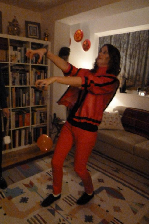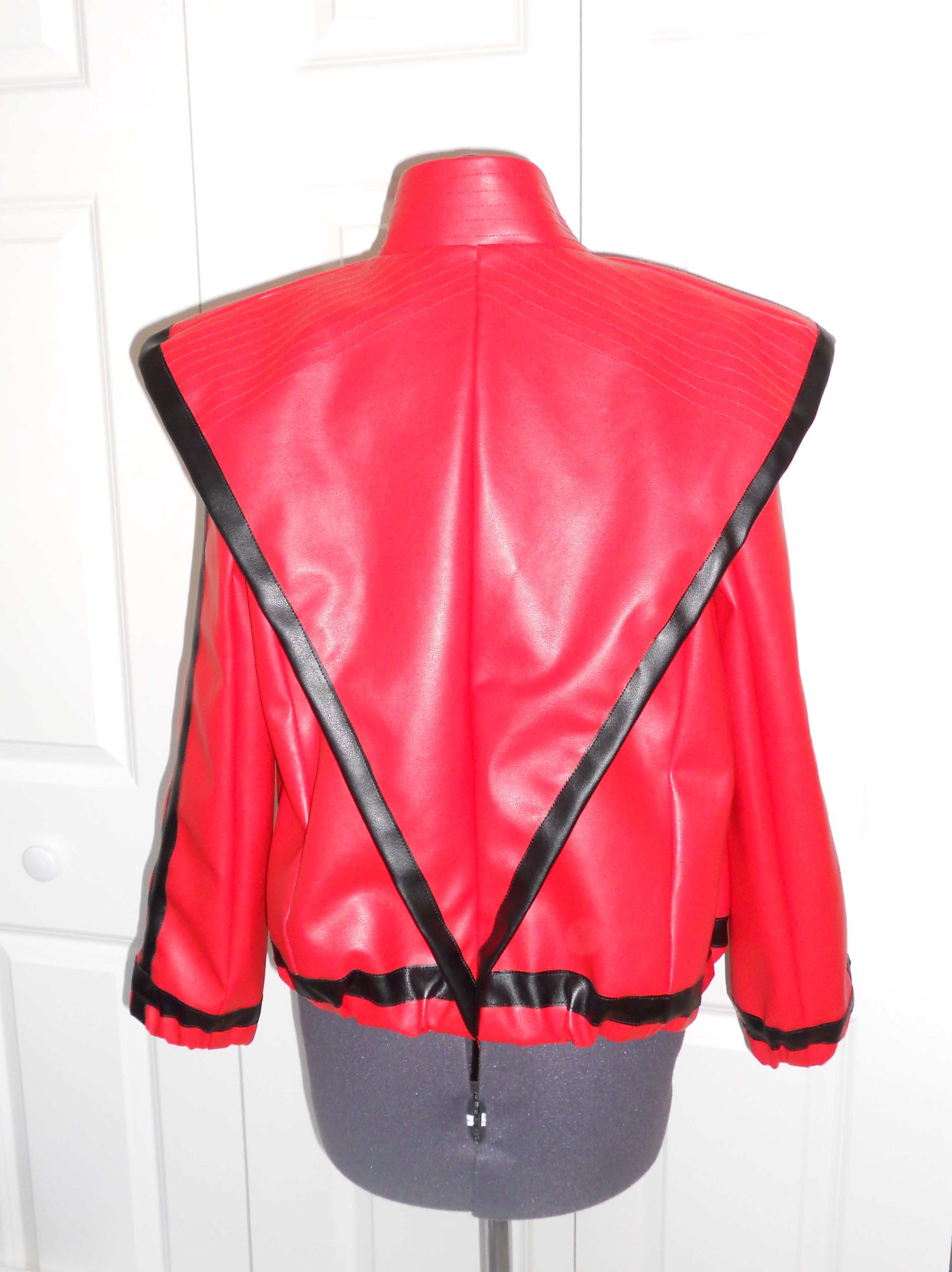 This is perfect for Halloween, as it’s zombie-tastic! After studying the video about 300 times, I had a pretty good idea about what was needed. A red leather jacket with black stripes, red jeans, white socks and black shoes. The jacket is obviously the key element to the look, it’s fabulous.