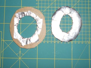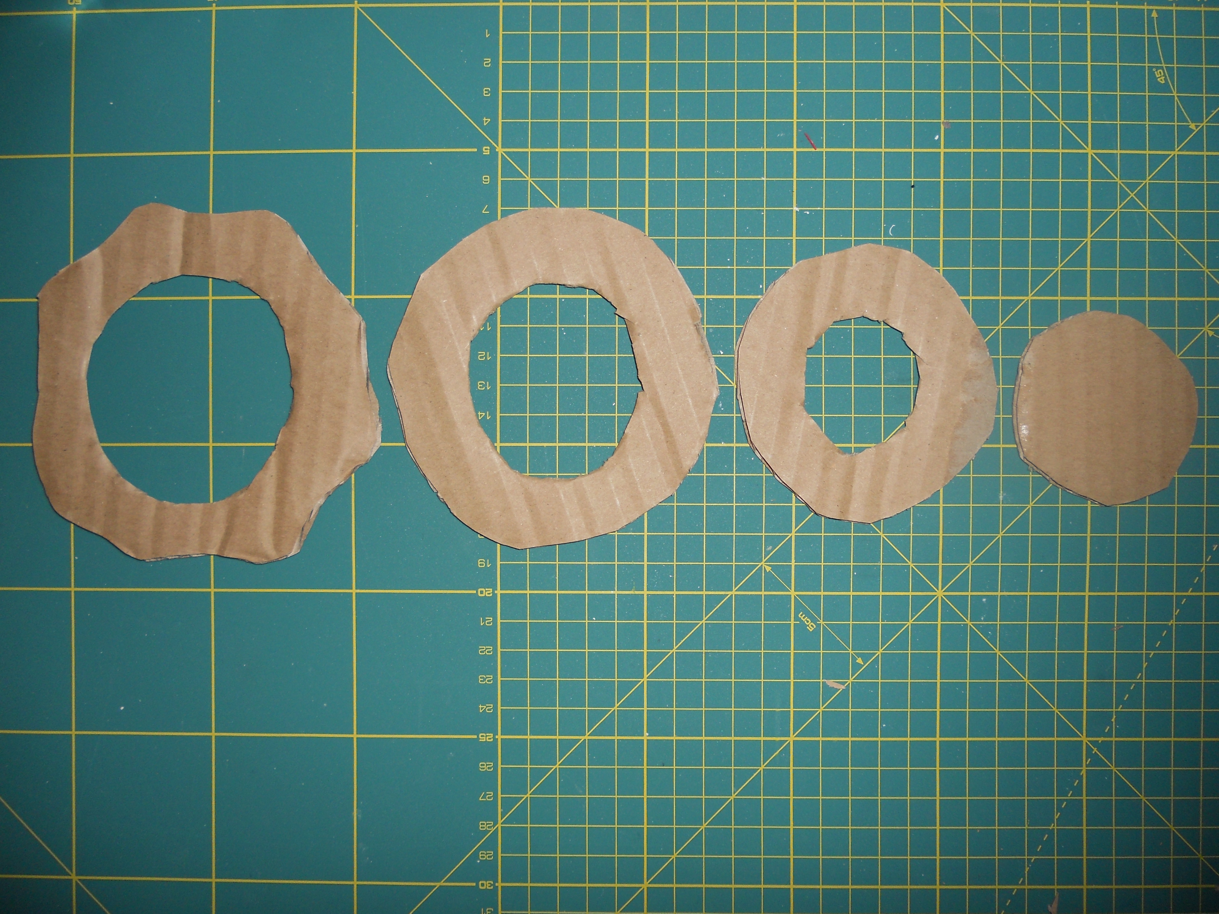To make the bullet holes I cut concentric circles out of corrugated card and covered them in kitchen foil. After making some prototypes, it transpired that the best way to do this was to cover the inside edge of the circles first, otherwise when the foil tears to fold round to the inside, it leaves gaps with the cardboard visible.