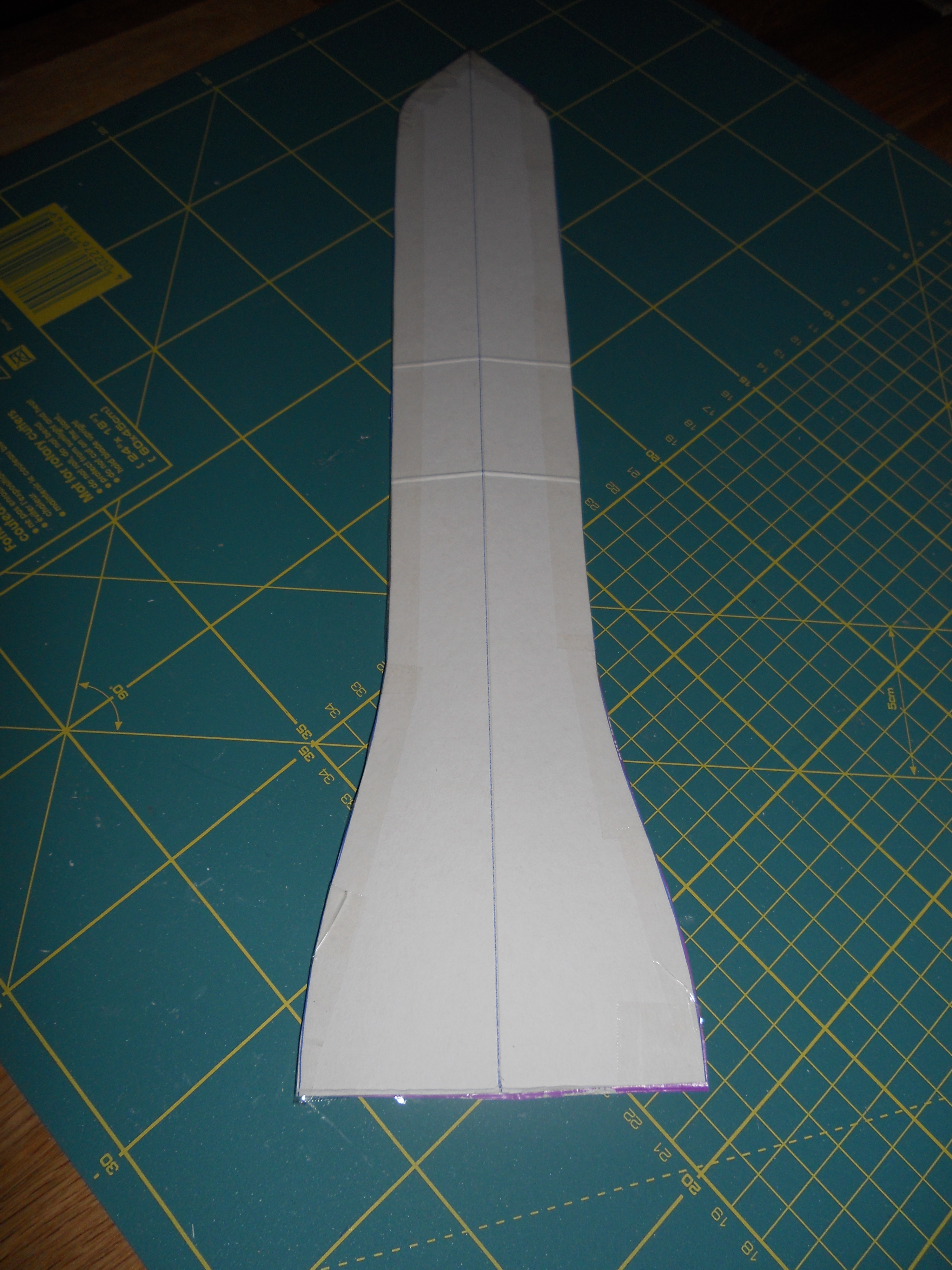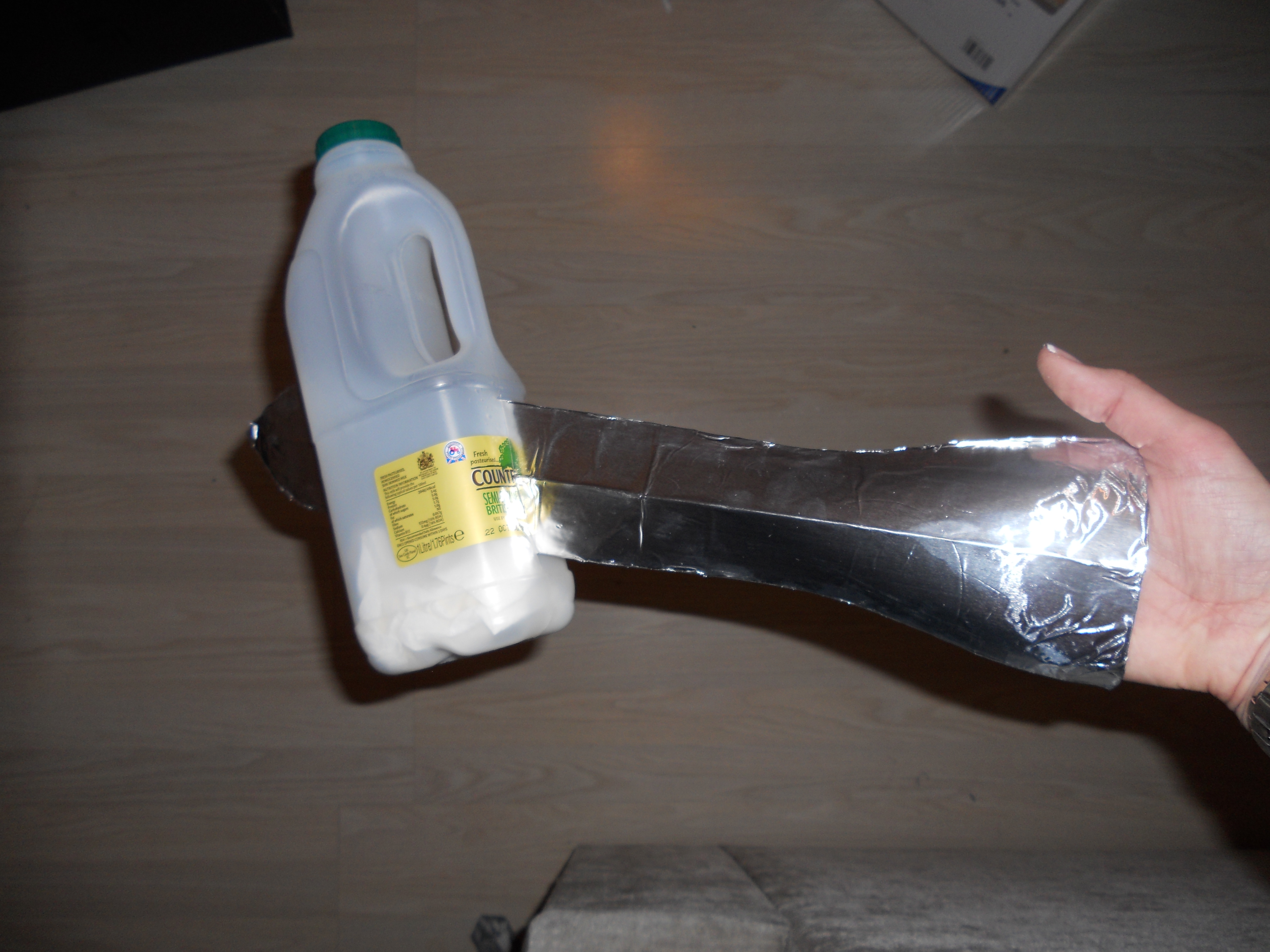 For the stabbing weapons, I used cereal boxes, and yet more foil. I cut two sword shapes with the base wide enough to accommodate Mr. Charity Shop Chic’s hand. I scored the swords down the middle and stuck them together with tape, then applied the foil.