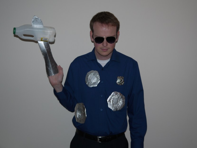 I also had the pleasure of making Mr. Charity Shop Chic’s costume. He wanted to go as the T-1000 from Terminator 2, which was an easy enough costume to make. Actually, his costume WAS recycled, as I got the blue shirt from the British Heart Foundation shop in Romford.