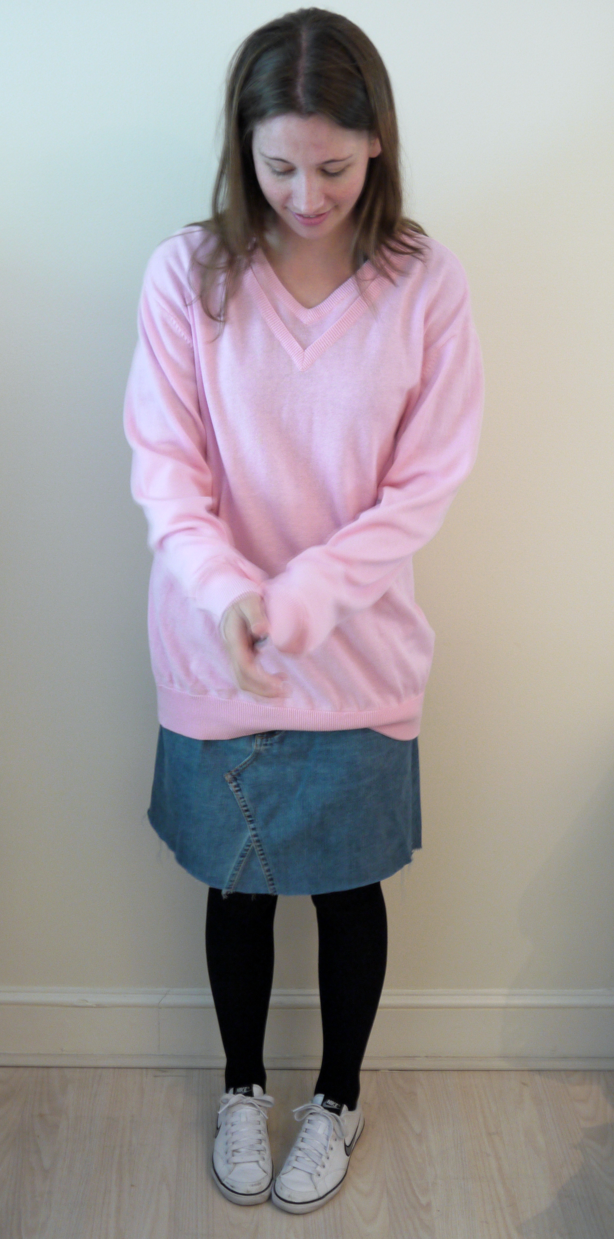 Measuring garments I already own gave me 52cm for a comfortable circumference for the new snood. The height was really determined by how much of the jumper was left.