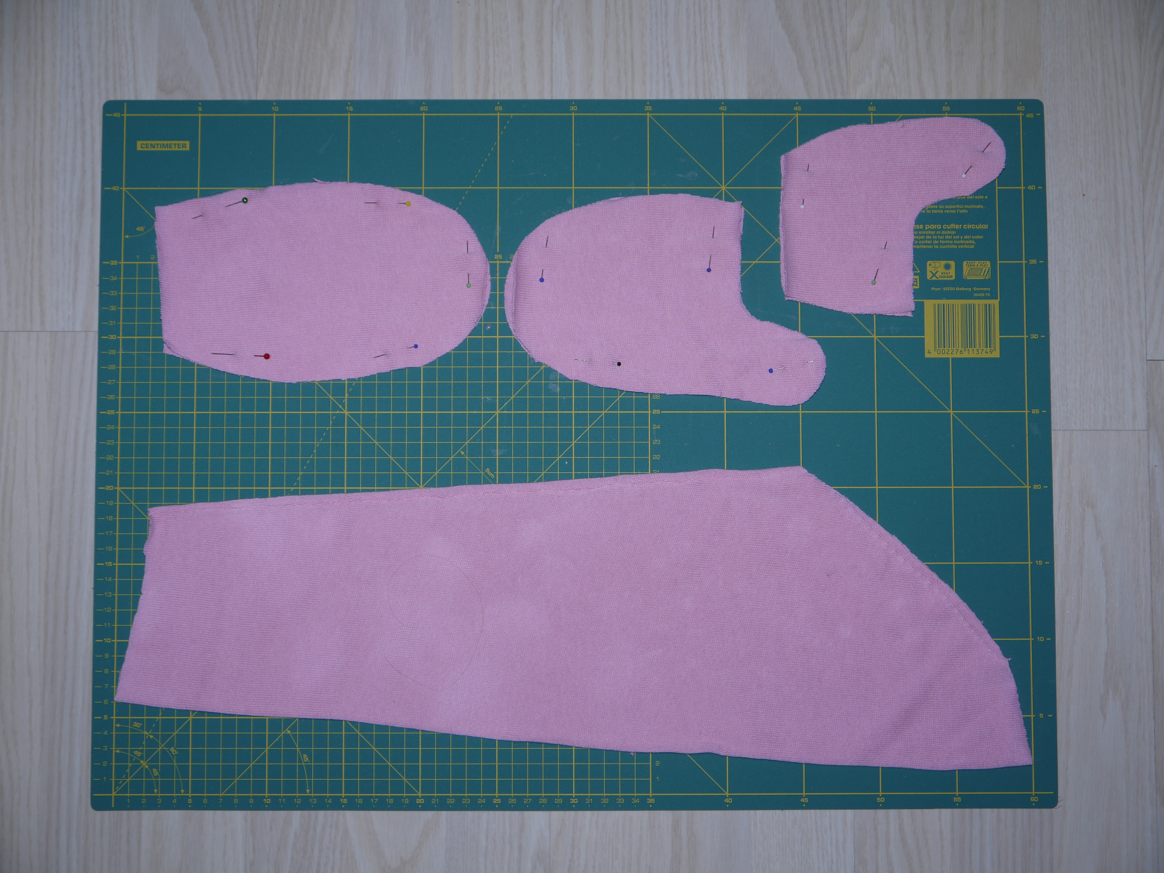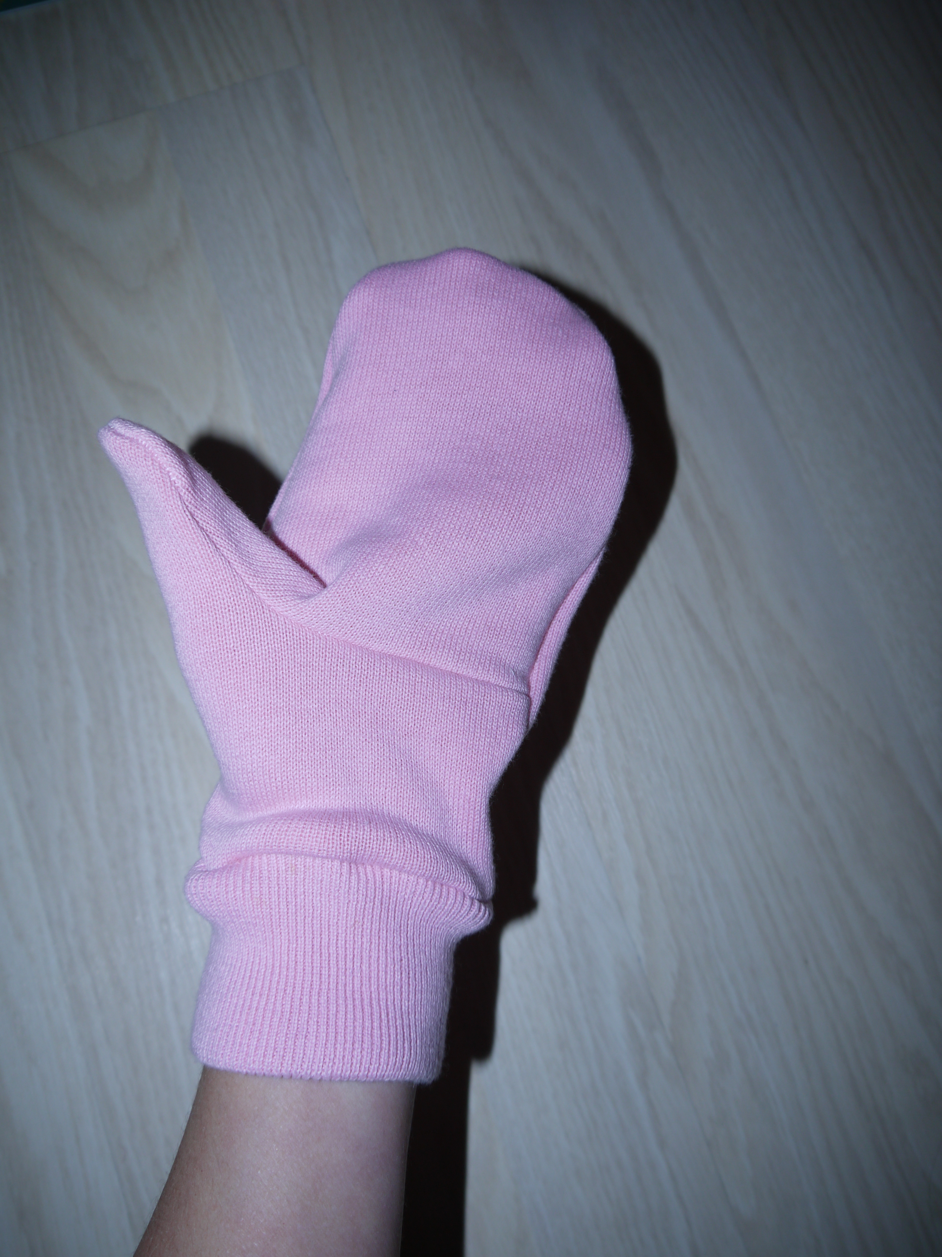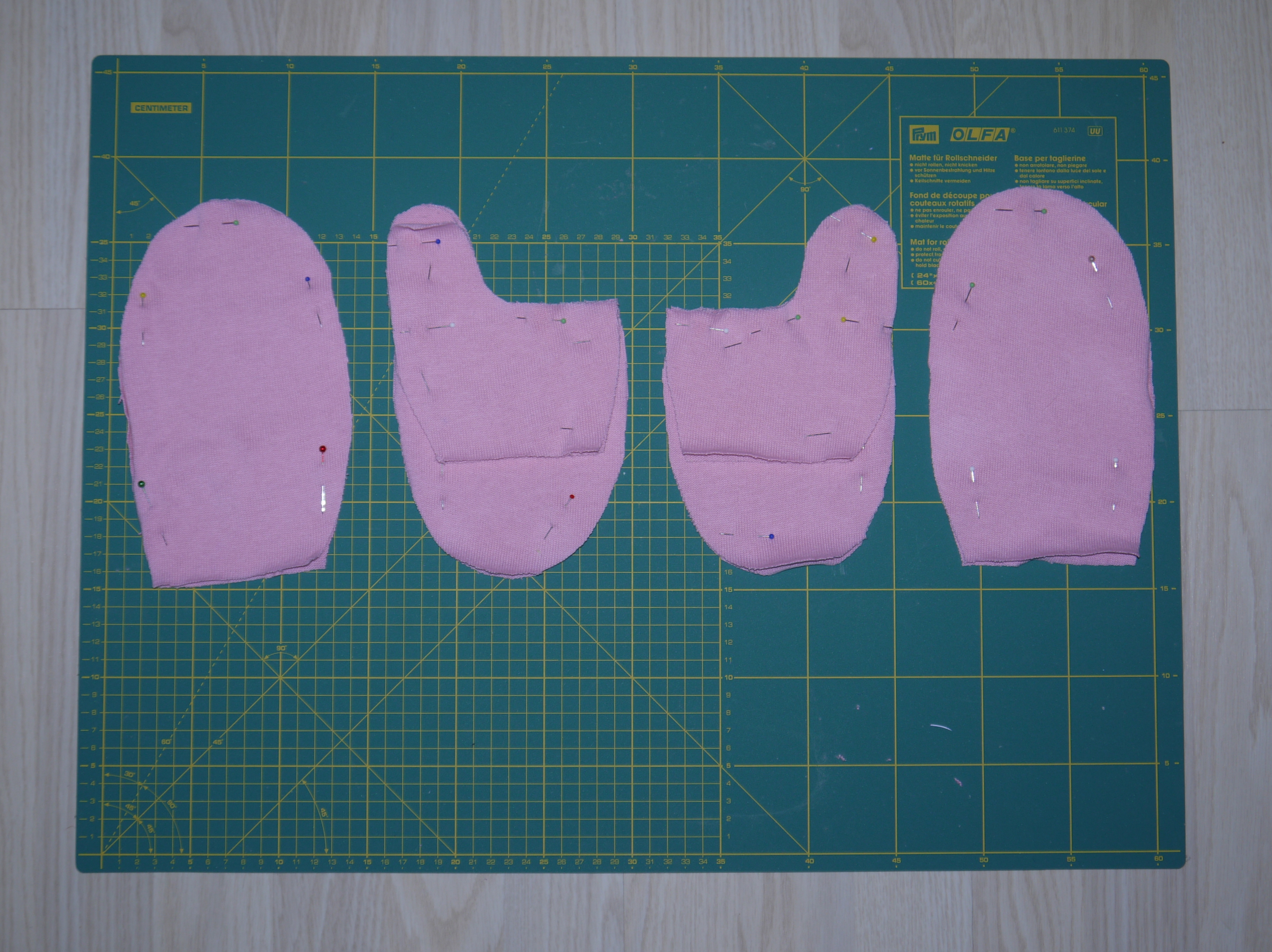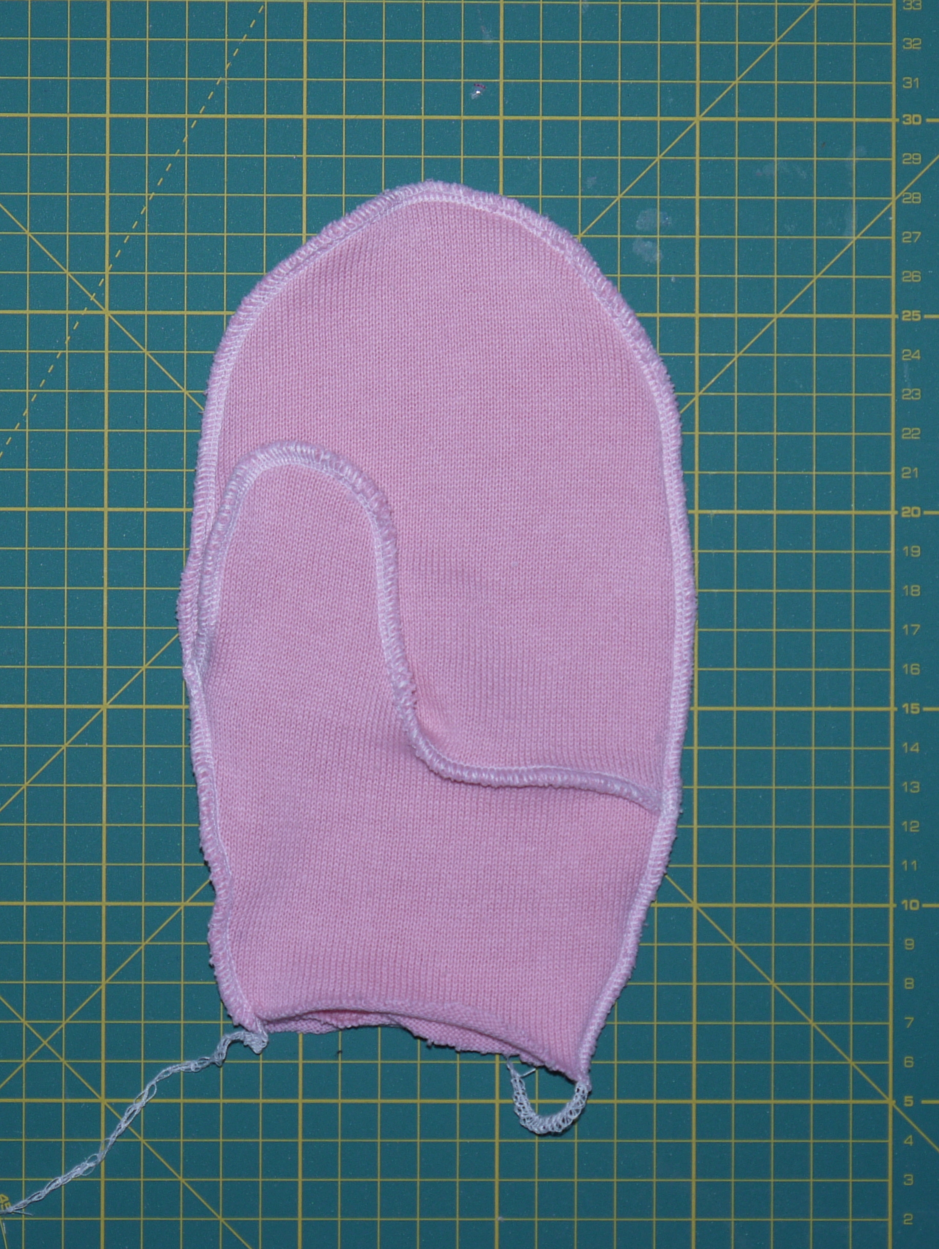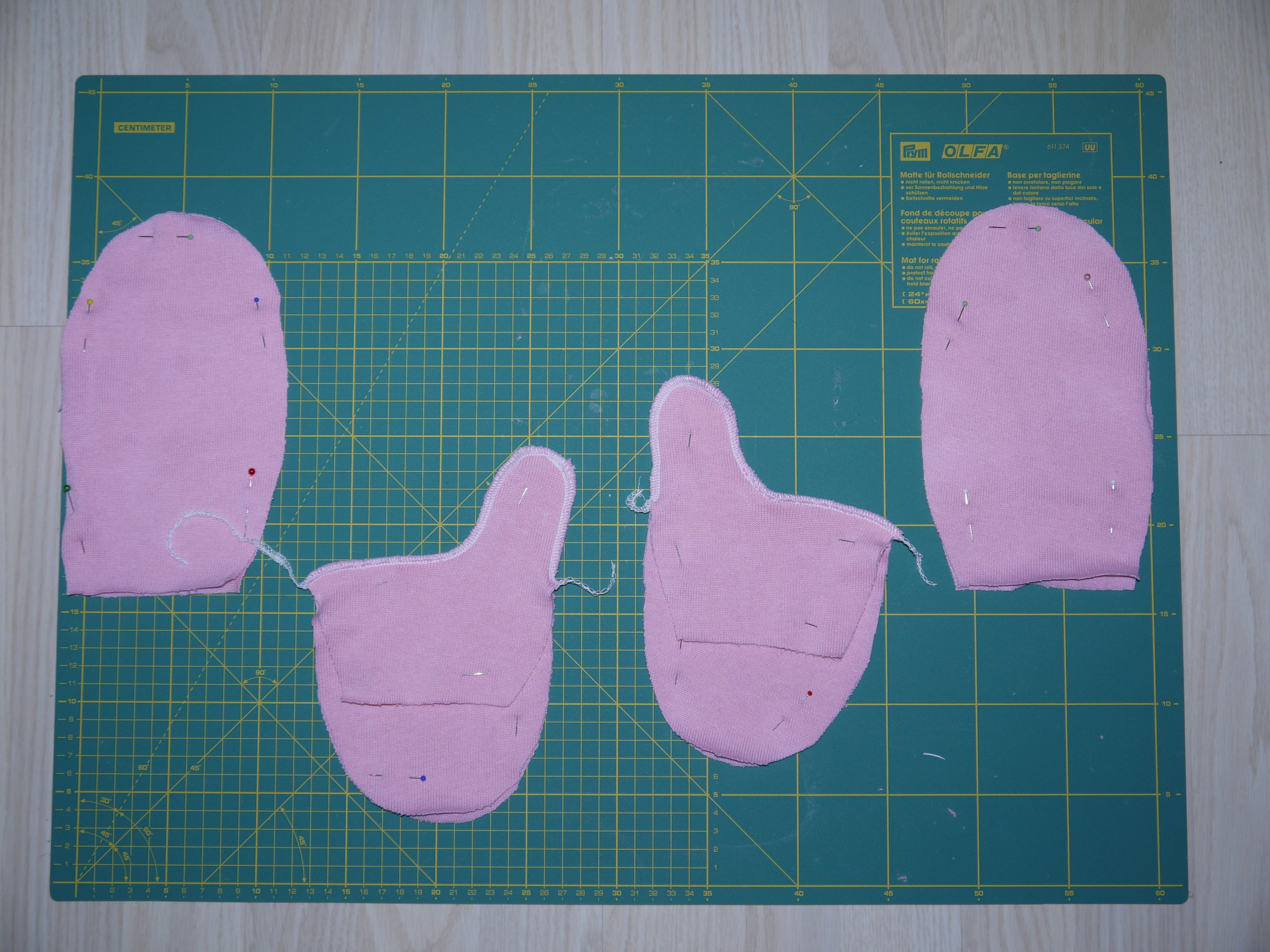 Then pin the back to the front (part 1), again checking that you have one right and one left mitten, and overlock them. You might want to pin the thumb out of the way.