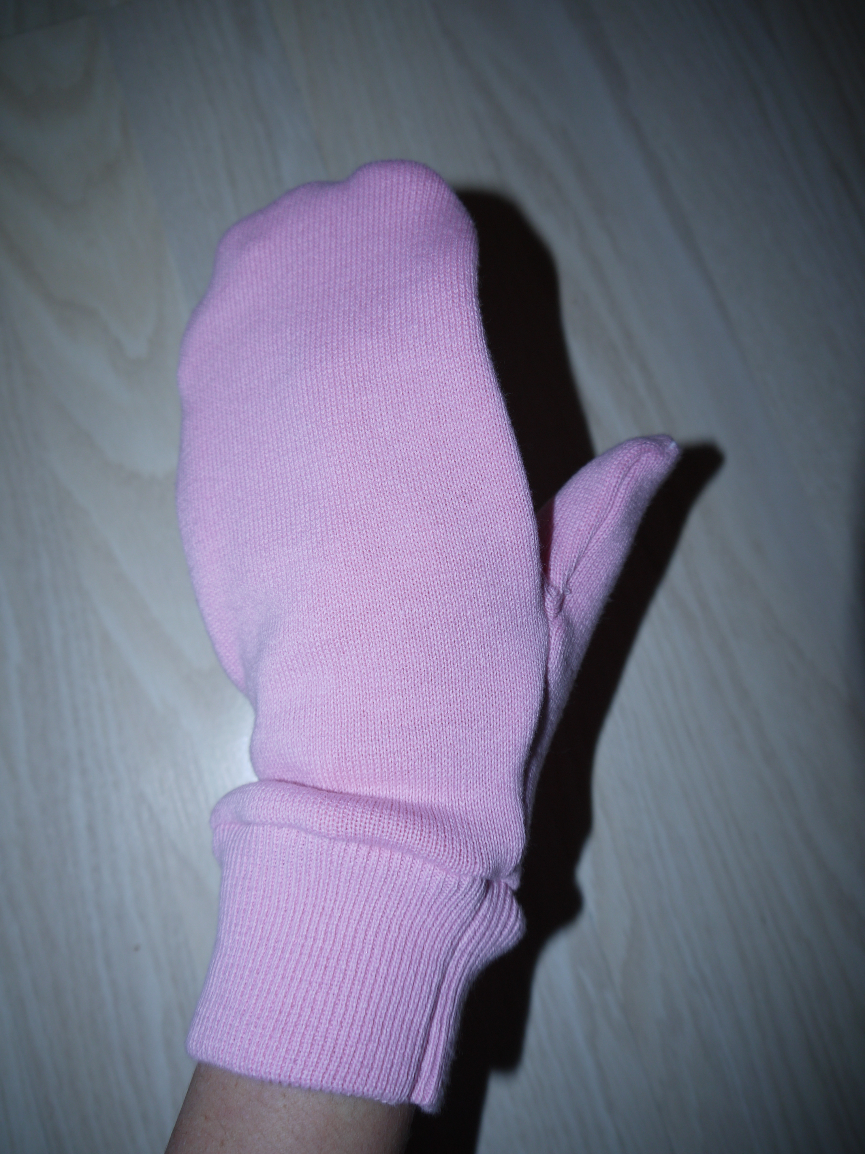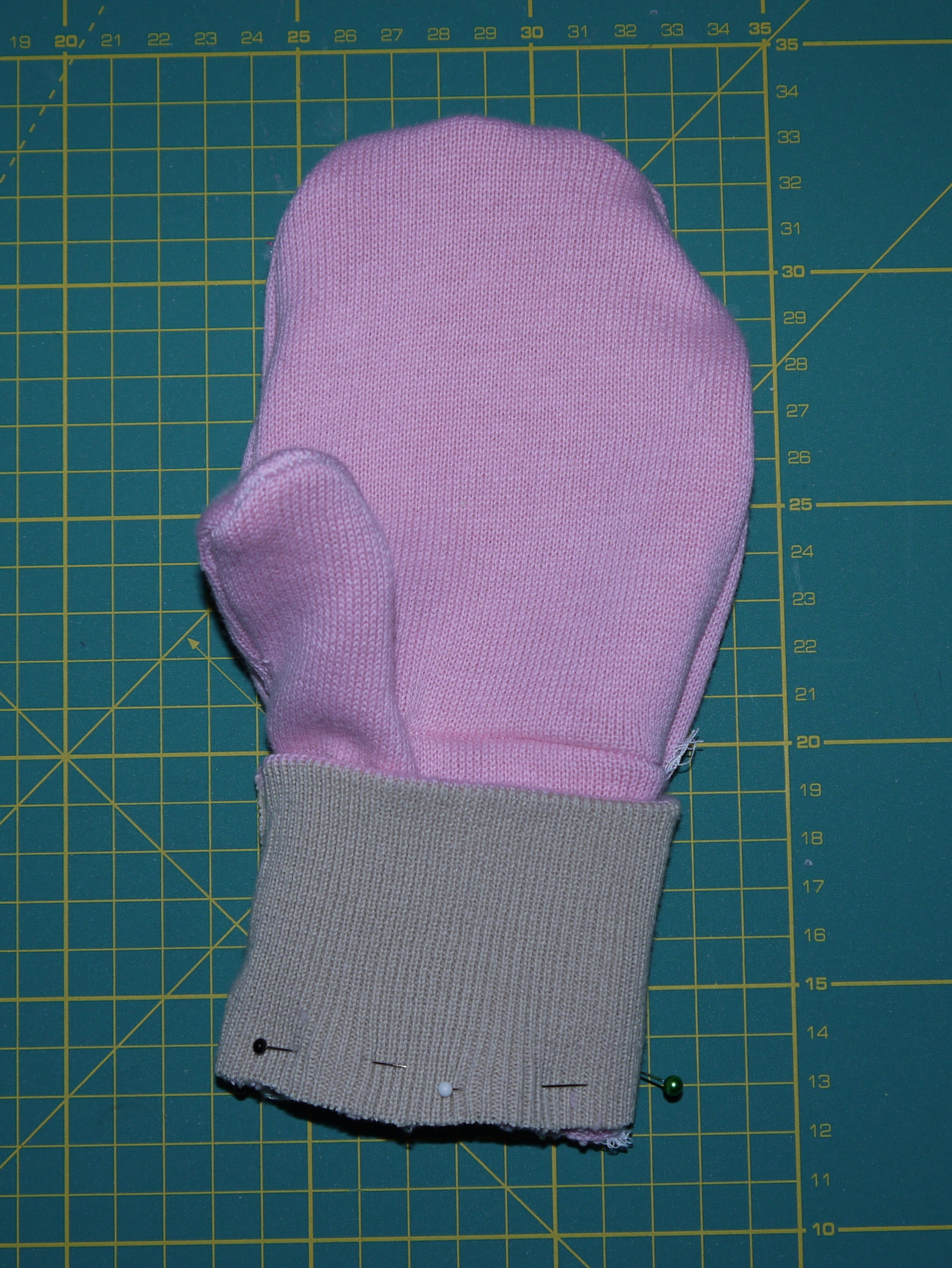 Attach the cuffs by turning each mitten right side out and the cuff inside out, so they are right sides together. Pin and overlock.