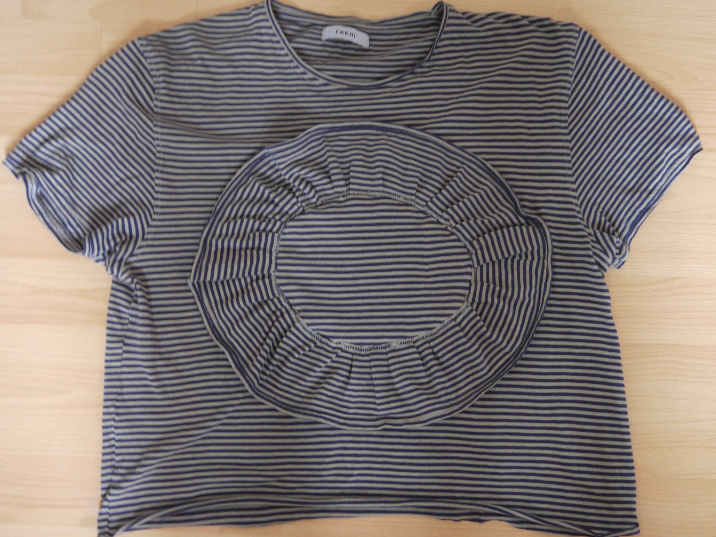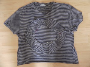 Then, I pinned the strips in a circle, making small pleats on the inside edge. For the largest circle I made sure to cover the slight damage on the shirt from where the pocket was.