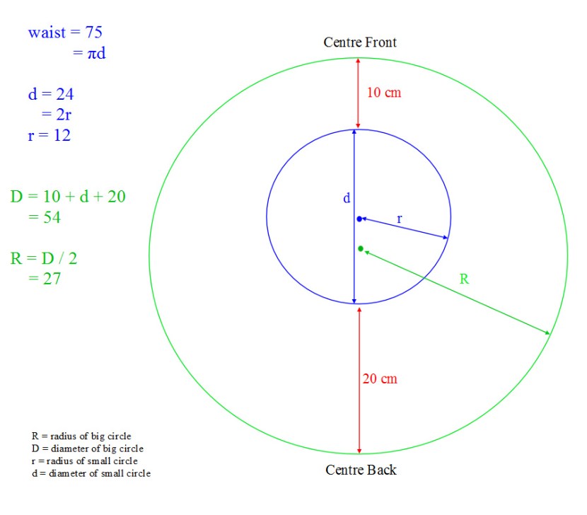 The green circle below is the bottom edge of the circle section. The blue circle is the waist line. I measured my waist, let’s call it 75 cm, so I could work out the diameter and radius of the blue circle. The blue and green circles are not concentric (their centres are different). This top part of the skirt is longer at the back than at the front, let’s call it 10 cm at the front and 20 cm at the back. This plus the diameter of the blue circle gives us the diameter of the green circle: 10 + 24 + 20 = 54 cm. Also, R – (r+10) = distance between the centres. And the circumference of the green circle = finished length of the gathered section = pi * D = 170 cm.