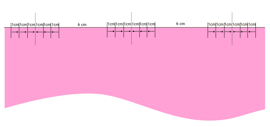 It’s a tube of material, gathered in some way, with 10cm cut off the top at the back. I had enough material left to cut a strip about 3.5 metres long, and I knew the circumference of the circle section to which it’s joined is 170cm, so the gathering ratio has to be no more than 2:1. Here’s what I came up with after making some samples. Six 1cm inverted pleats, spaced 6cm apart. The inverted pleats look a bit strange until you push their centre up and out from behind, so it looks a bit more like the inspiration picture.