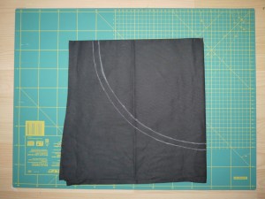 Here’s how I transferred this to muslin. I am using black muslin to show up the white chalk. First I folded a piece of muslin in quarters and marked some points each R centimetres (27cm) from the centre. Joined to form a circular arc. Did the same at 28.5cm for a seam allowance and cut it out.