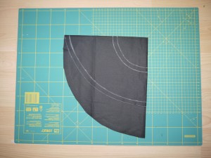 Then, I folded the circle into four again, but this time, (10cm + r) from the edge, for the centre of the blue circle. Drew another set of points at r centimetres (12cm) from the centre, and another at 10.5cm for a seam allowance, and cut that circle out…. and bingo, the circle section of the skirt.