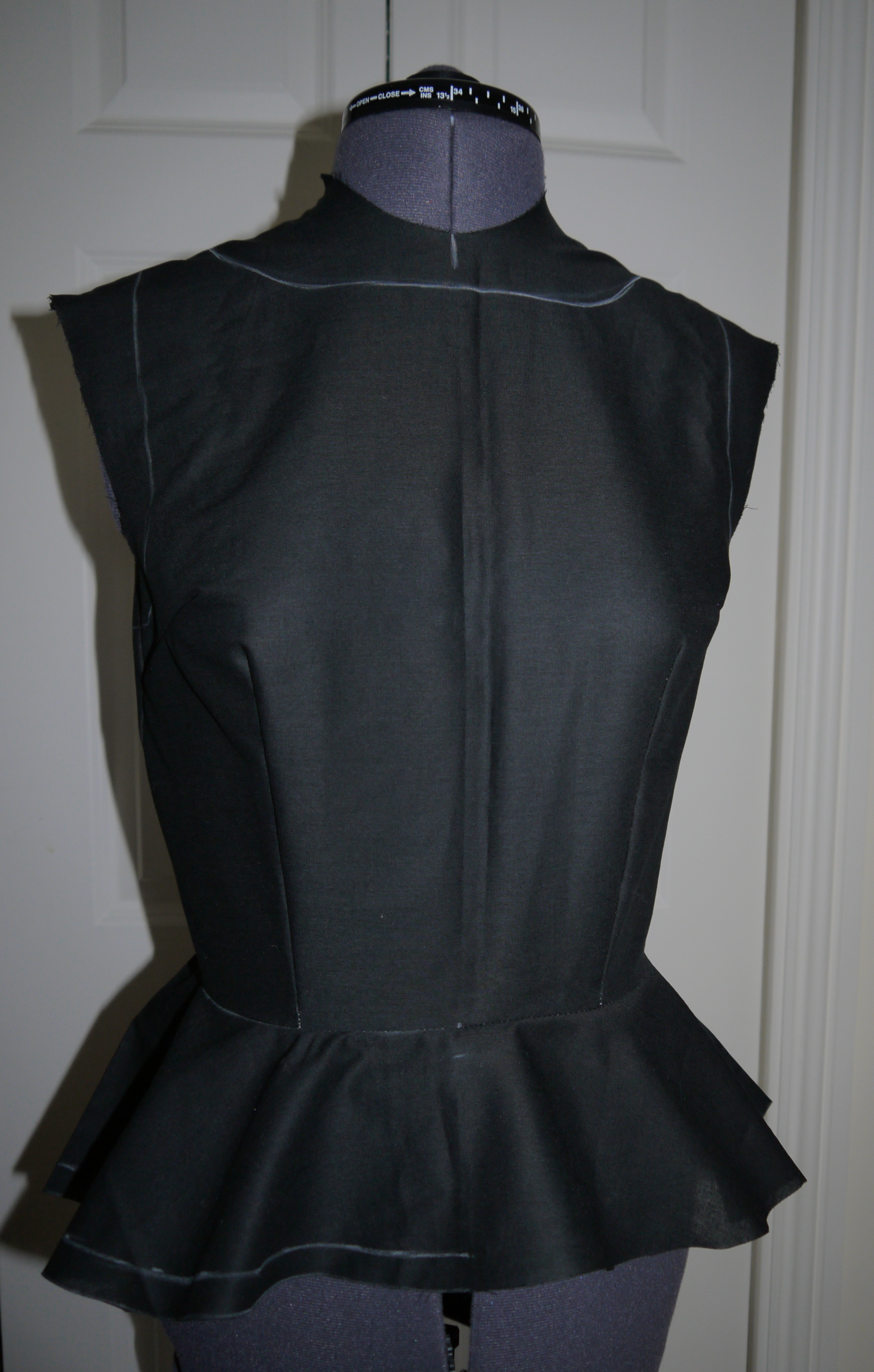 First I made up a basic bodice using my custom-fitted block, joined it to the circle section to see how it looked, and put it on my dressform.Then I could draw the style lines on it in chalk.