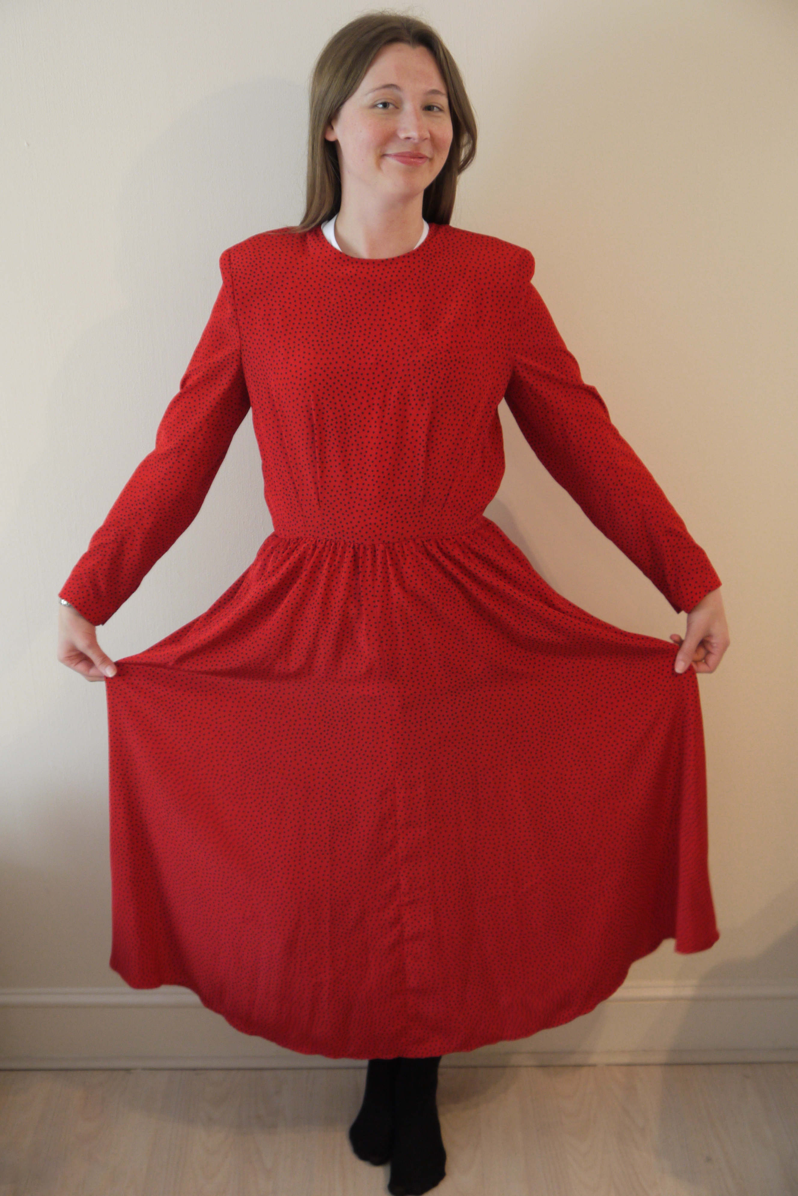 Clearly, I’m going to have to pull something pretty special out of the bag… Luckily for me, then, that I found this extremely fabulous Liz Claiborne dress on a recent trip to San Francisco. It came from my favourite SF thrift store (Thrift Town in the Mission District) and cost $9.99. The scarlet colour and black polka dots make it a dead ringer for the Dior.