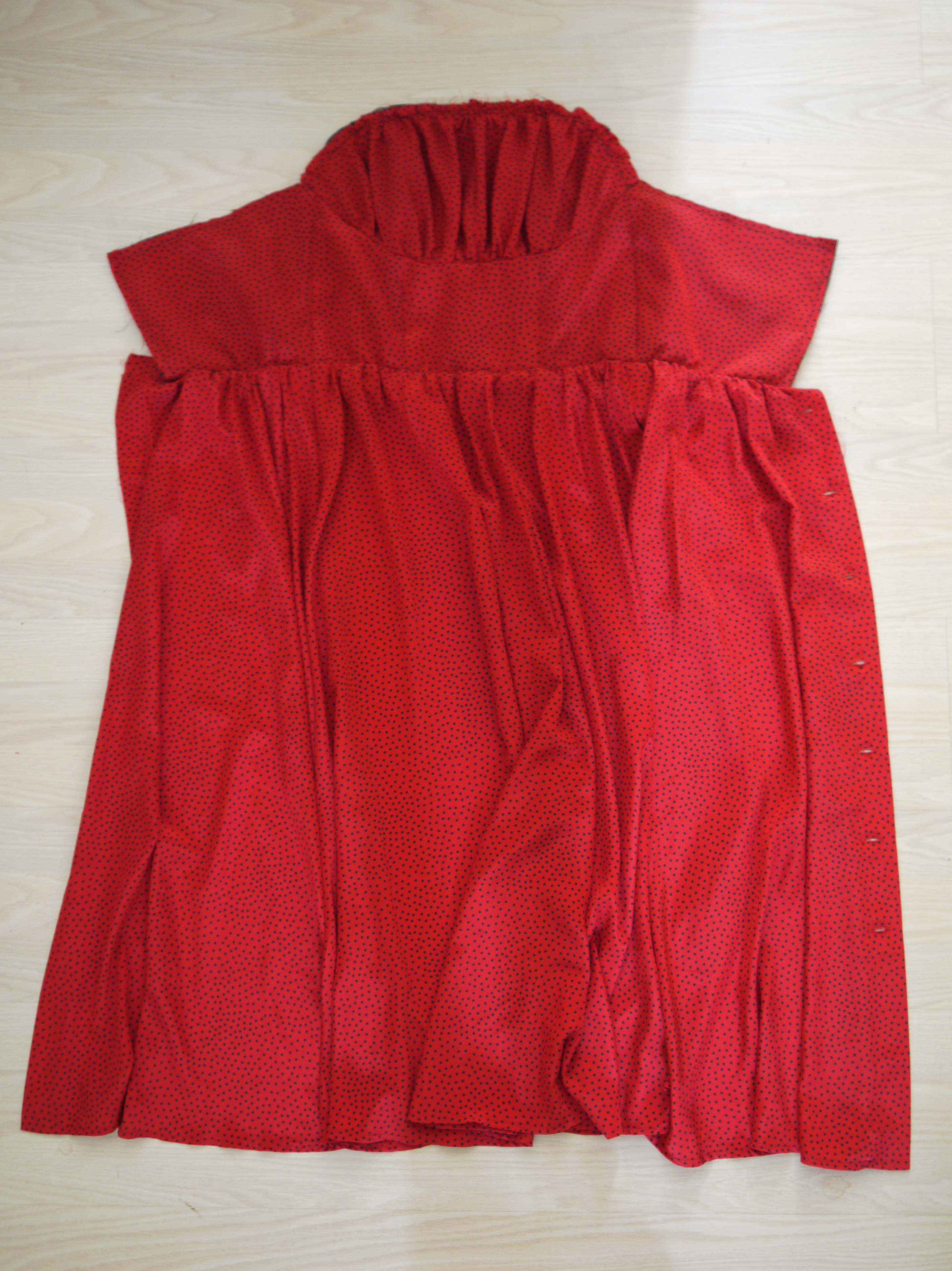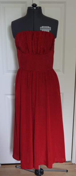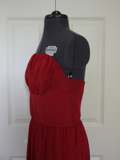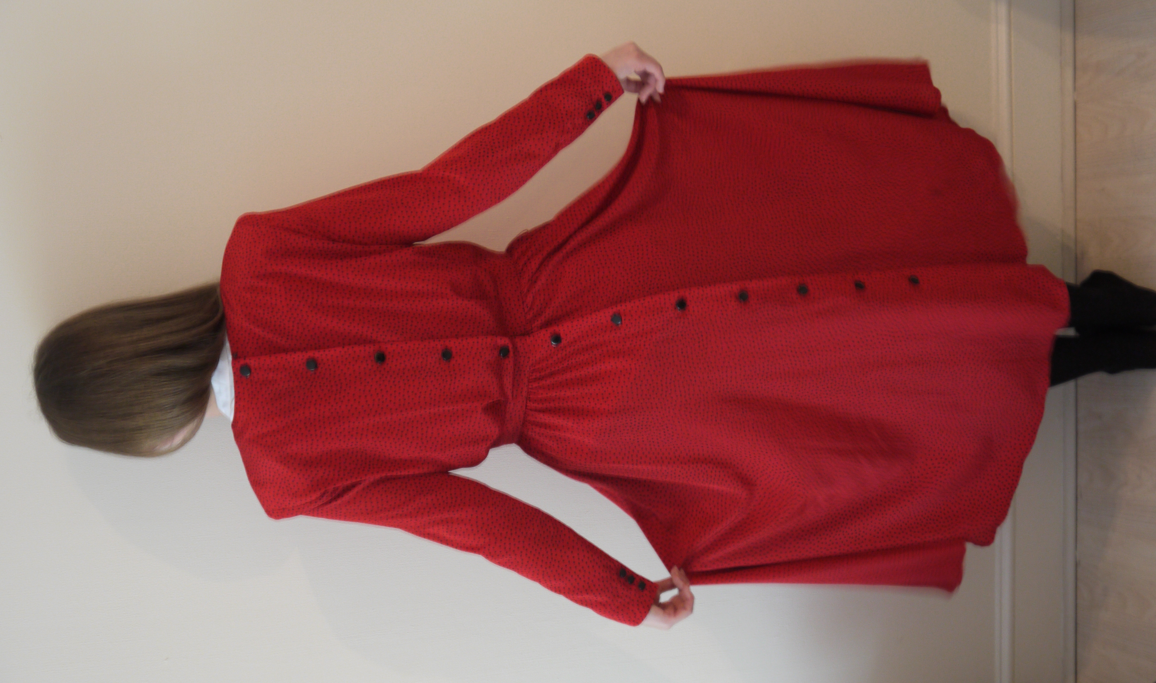 I then cut off the buttons and the button stand from the skirt, made a back seam, and sewed in a black zip down the back. Here’s how the completed dress looks on the stand. Not bad!