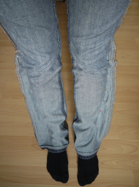 First, I made the boot cuts into skinnies. Wearing the jeans inside out, I pinned out the excess down the outside of both legs, then stitched along the lines. You can see the bottoms have already been taken up!