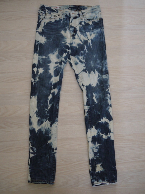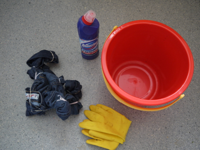 Basically you put the balled-up jeans into a bucket of bleach and leave it there until it’s changed colour.