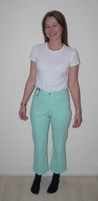 The cut is so wrong for me. They are about lower calf length and flared at the bottom – no idea what body shape actually makes these look good. They are rather high waisted though – which I like – and I also love the colour. Turquoise is a great colour for this time of year and my wardrobe is slowly gaining turquoise pieces.