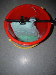 I opted to bleach the bottom half! This is best done in a bucket with the shorts hanging from a hanger attached to the side of the bucket. If the shorts fell in, the project would be ruined. Also, the bleach soaks up the fabric, so you only need about half the depth you think you do. I found this out the hard way; these shorts are more white than blue now. I still love ’em though!