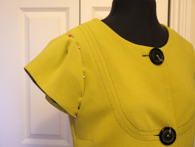 I pinned one on, playing with it until it was in the right place, then marked the seam line with contrasting thread, using this line to cut the new cap sleeves. Being sure to cut both left and right sleeves the same, obviously ;-)