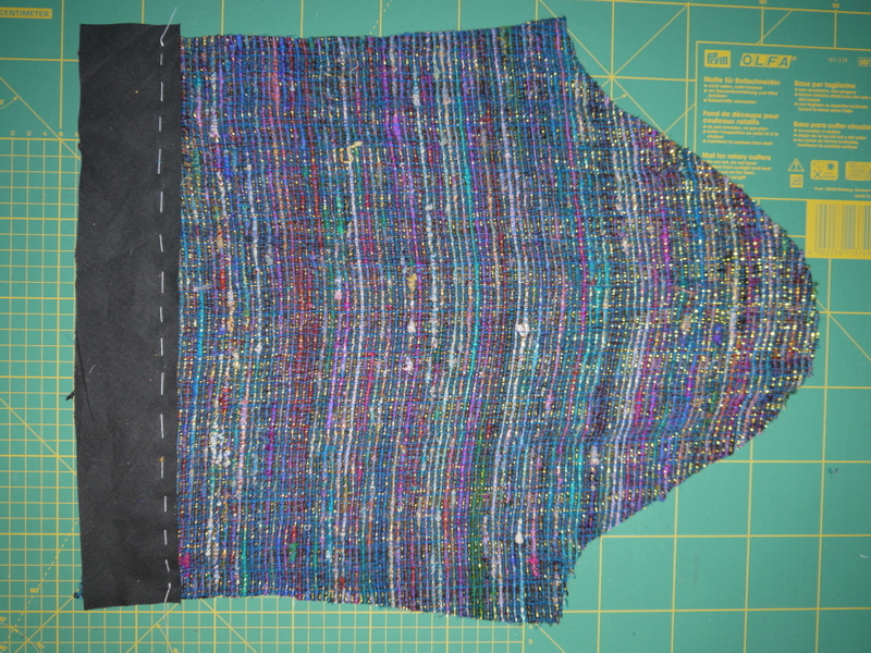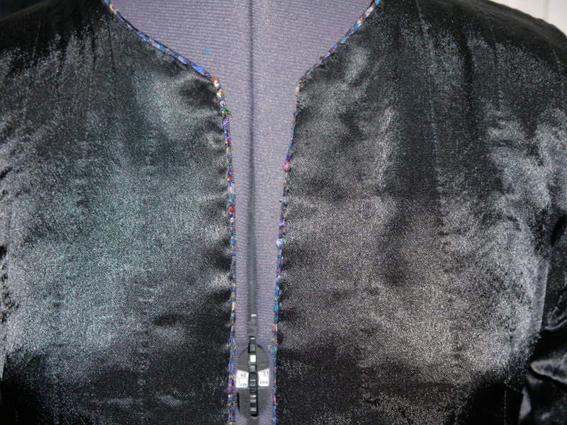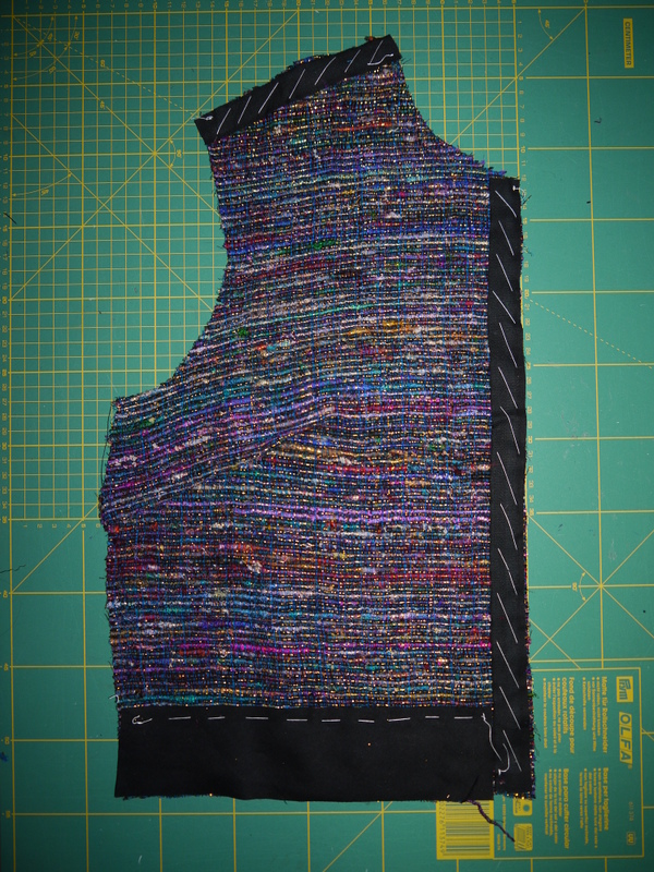 Here’s what to do to make it really neat. Working between the shell and the lining, pull both threads through to the inside and tie them in a double knot, trimming the ends. I had to do about a million of these which took ages, but it’s worth it. You can see that I am using black thread on the top (lining) side, and had blue thread on the bottom (fashion fabric side) bobbin, to roughly match the warp of the fashion fabric. The blue stitches are not noticeable from the outside of the finished jacket!