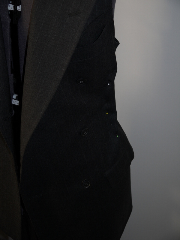 Here’s how the front looked. I played around with some pins trying to get it to hang right. To move the neckline a bit further up, I decided to change the roll line of the lapels by adding another buttonhole so the second button could be done up.