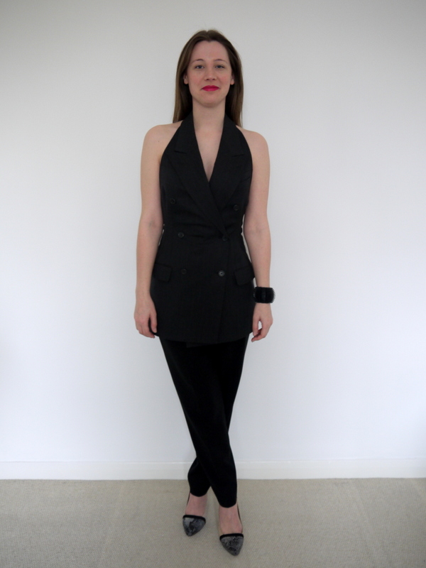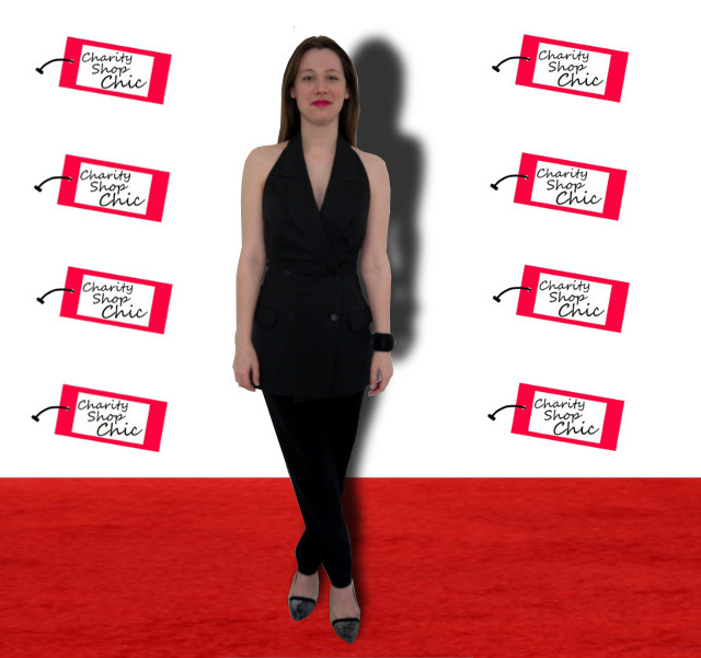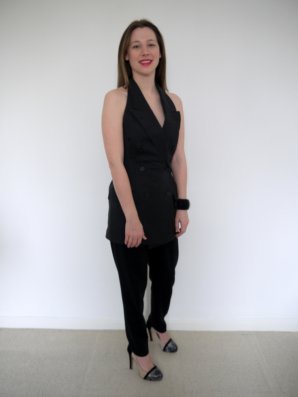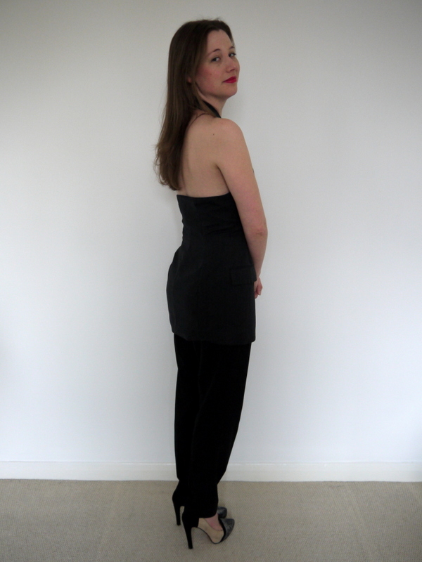 I paired it with black trousers to get the look of the original jumpsuit, plus pointed toe platforms. In case you’re wondering, it’s just about long enough to wear as a dress, but only if I don’t want to sit down, so I won’t wear it that way. I am seeing rather a lot of tuxedo-inspired looks on the red carpet at the moment, so this may not be the last men’s jacket remake you see from me!