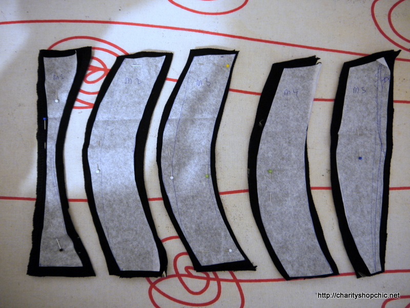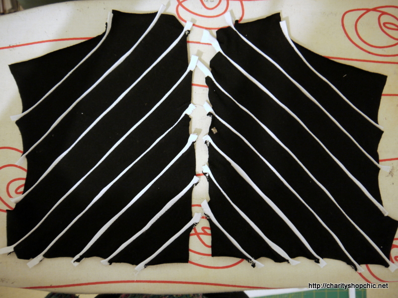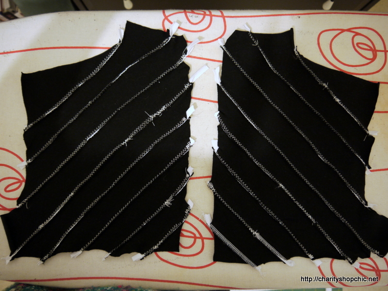 Here are a few more work in progress shots. The plain black one is the back of the dress – cut from the third T-shirt. That was pieced as well, though not into quite as many pieces.