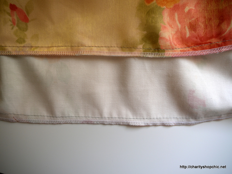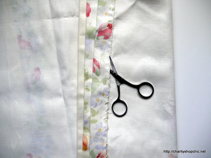 I started cutting the side hems of the curtains before giving up and just cutting the whole of the hems off at the sides, bottom and top. I was left with a large rectangle which I cut in half. Happily, the length of the original curtain was such that it was still long enough to reach my ankles, but if it hadn’t have been, I could have used the other curtain.