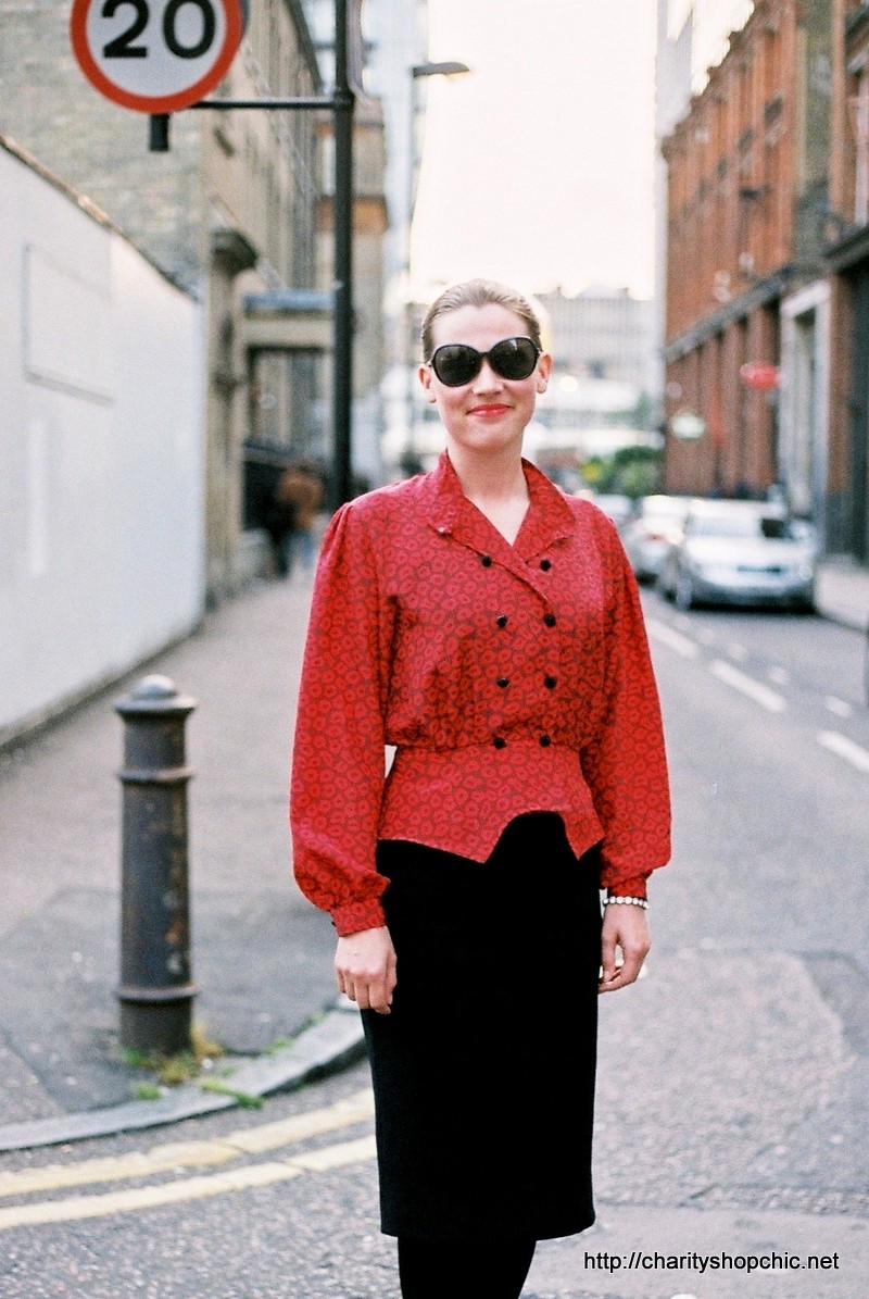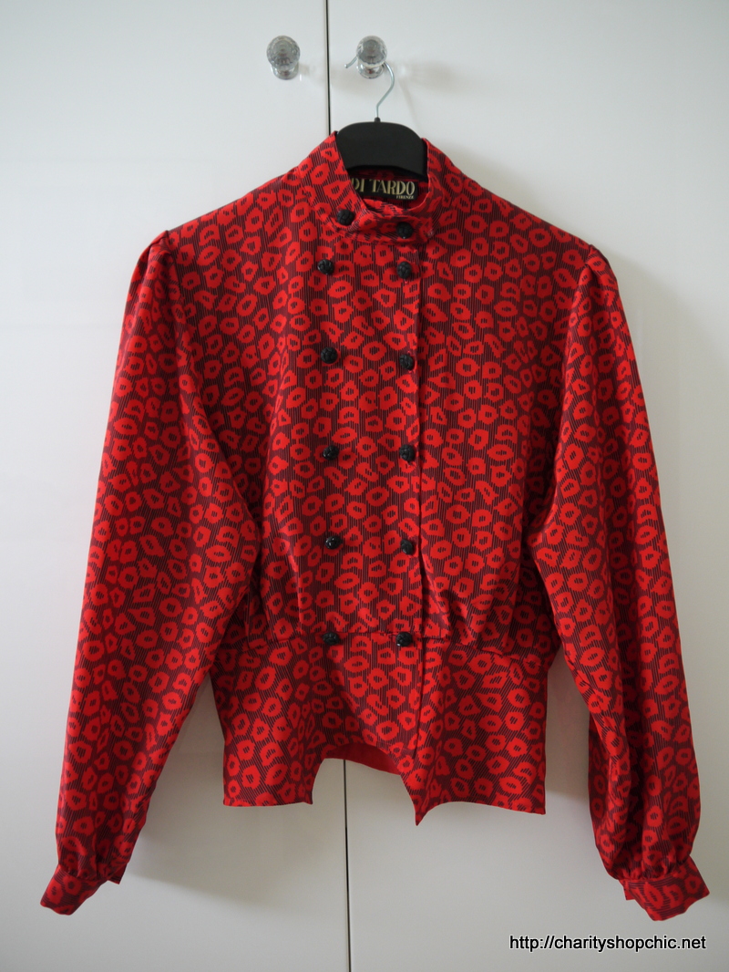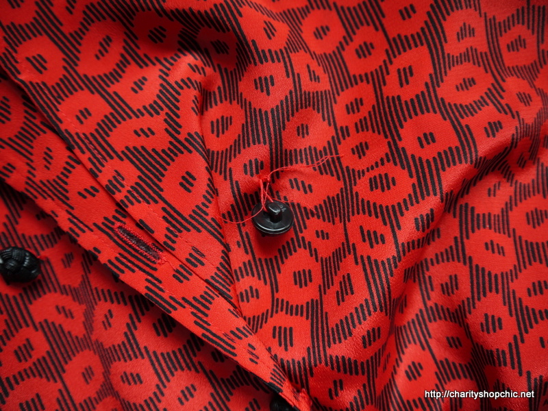 I bought this fabulous retro blouse on a charity shopping trip to Bolton last autumn. Unfortunately the swing tag is missing, but if I remember correctly, it came from the Marie Curie shop as part of a 3-for-£10 offer they were running at the time. The label is marked “DI TARDO – FIRENZE”. It’s marked size 12 but the waist is only just big enough for me. The blouse has a fantastic rather retro shaped peplum which I am keen to copy in a future garment! The sleeves are huge, big and blousy. The buttons are big black plastic and they are that type that look like a monkey’s fist knot.
