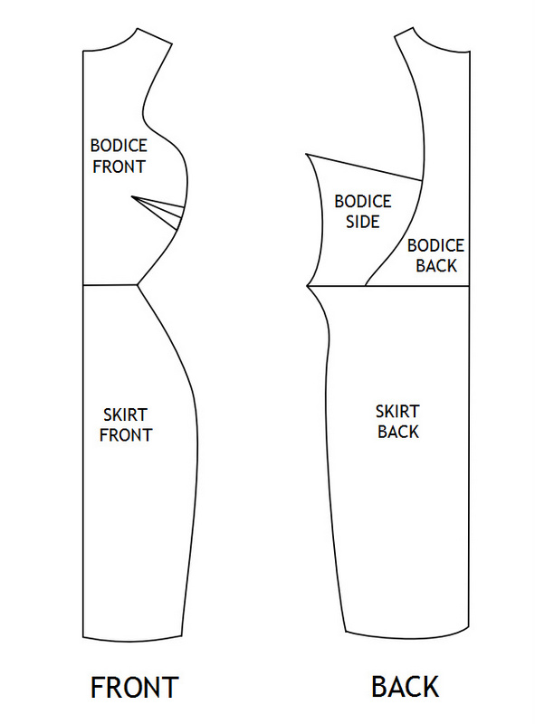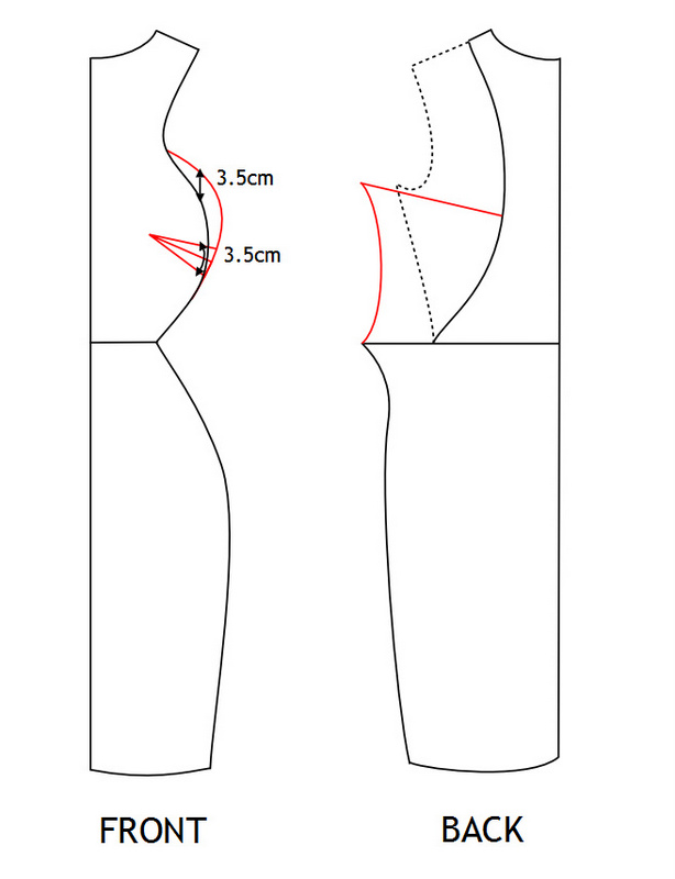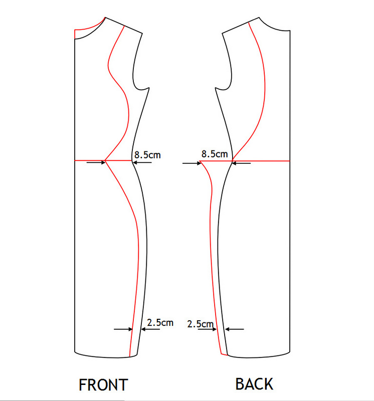 Here’s a rough idea of what I did. I drew a waistline, separating the dress into a bodice and a skirt. I drew in the new curves for the back and front blue sections. This meant adding 8.5cm graduating to 2.5cm to the back from the waist down, and subtracting the same amount from the front.