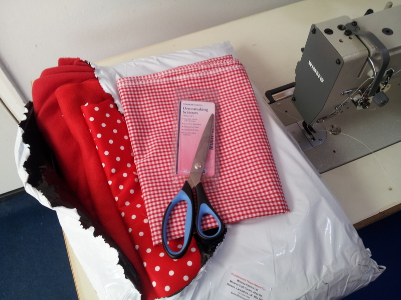 Based on a shopping list from Rosie, I picked red polar fleece, red gingham, red felt and red polka dots, along with a new pair of fabric scissors from Minerva’s website.